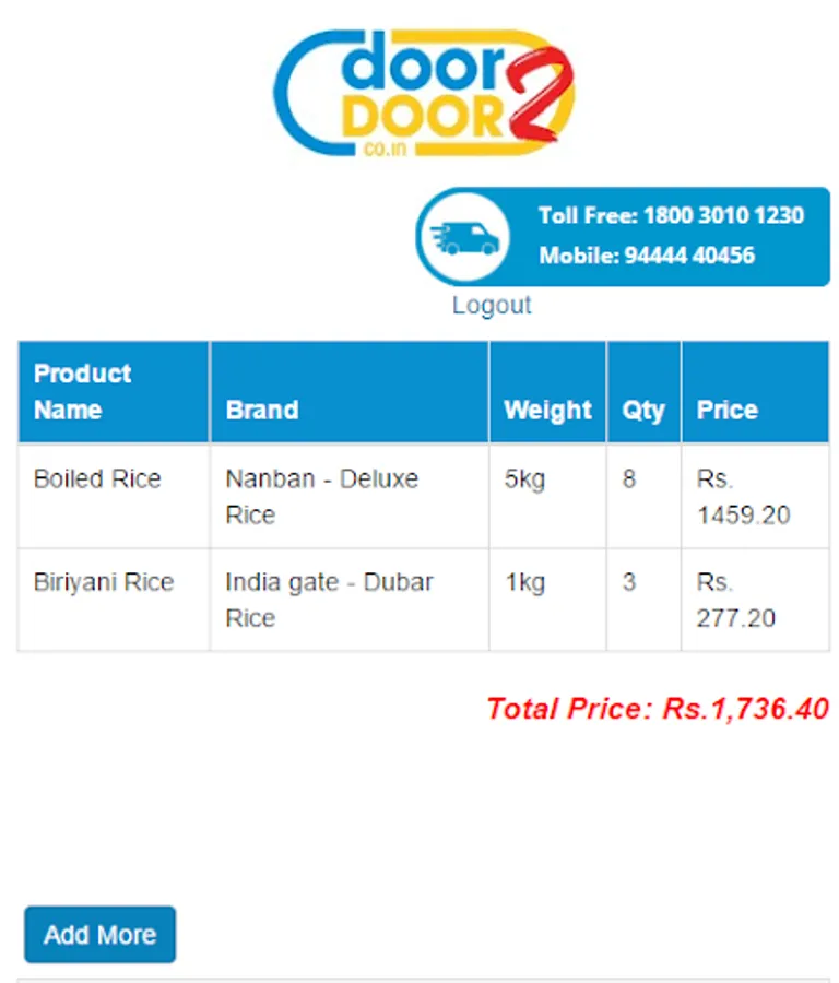 Door2Door.co.in, a unit of Dravidian eRetail Services Private Limited is an Online Grocery shopping store and Home needs Supermarket providing free delivery services to the entire Coimbatore region. Door2Door.co.in is changing the way people buy groceries. We are replacing your visits to the super market with a few clicks on phone. Door2Door.co.in focuses on accurate and on time grocery door deliveries, we are now available throughout Coimbatore. Quality products and ethical delivery is our motto. We help to buy your home needs and groceries in your limited budget with very less time.