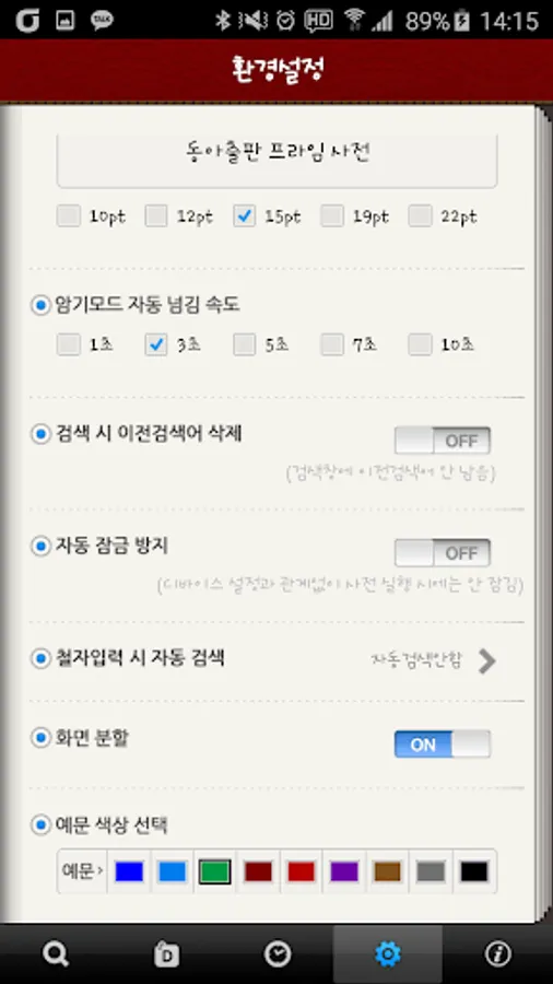 6. Various personal customization functions added: Delete previous search words on/off, screen slip prevention on/off, spell input simultaneous meaning screen VIEW settings added!