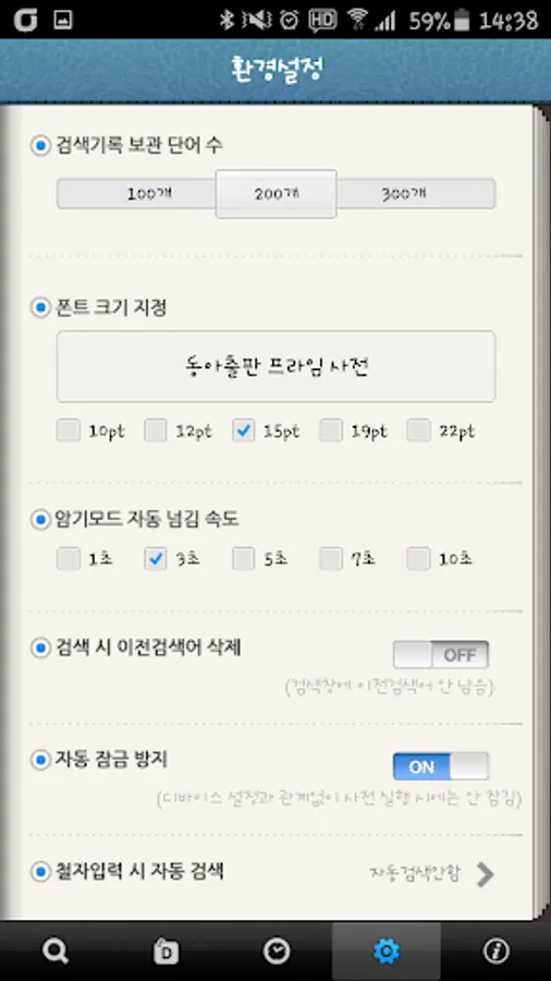 6. Add various personalization features: delete previous search words on / off, screen slip prevention on / off, spelling input simultaneous meaning screen VIEW settings added!