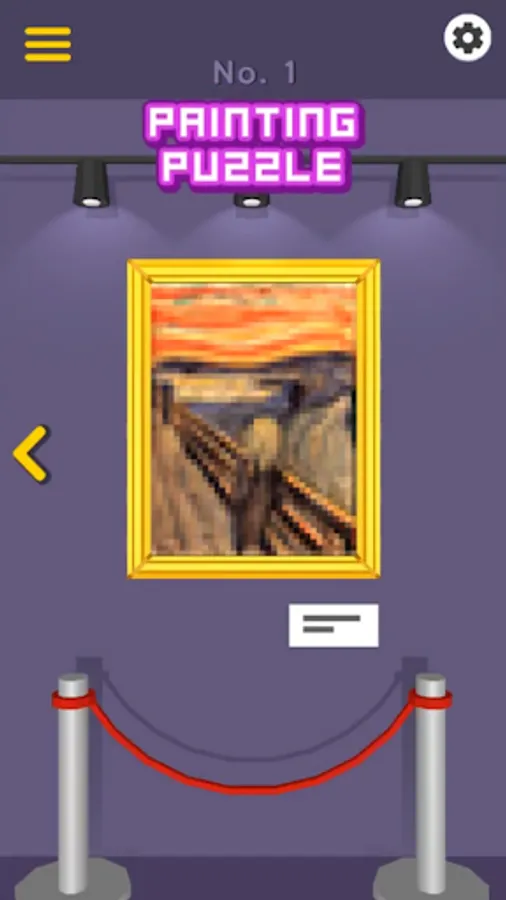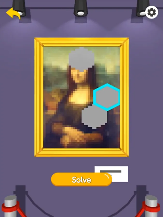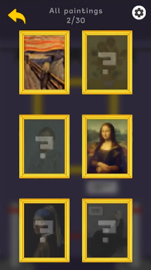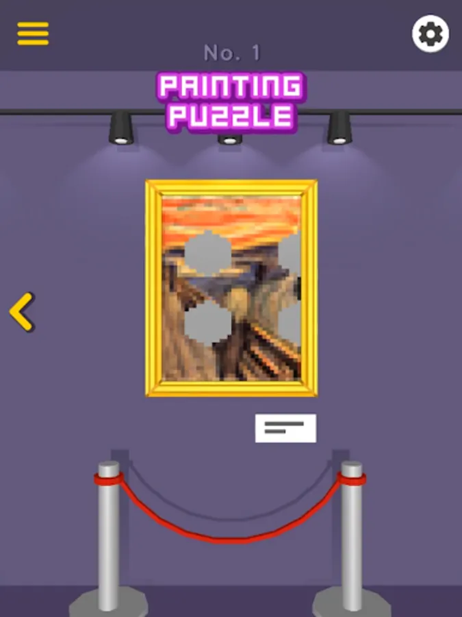 All paintings have in total of 14 fragments. Tap on a painting and select the fragment. Press the "Solve" button to start unlocking the selected piece. Complete all the pieces to collect the painting. Tap the left or right arrow to navigate to different paintings. You can also tap on the "Paintings list button" on the top left corner to view all of the paintings.
