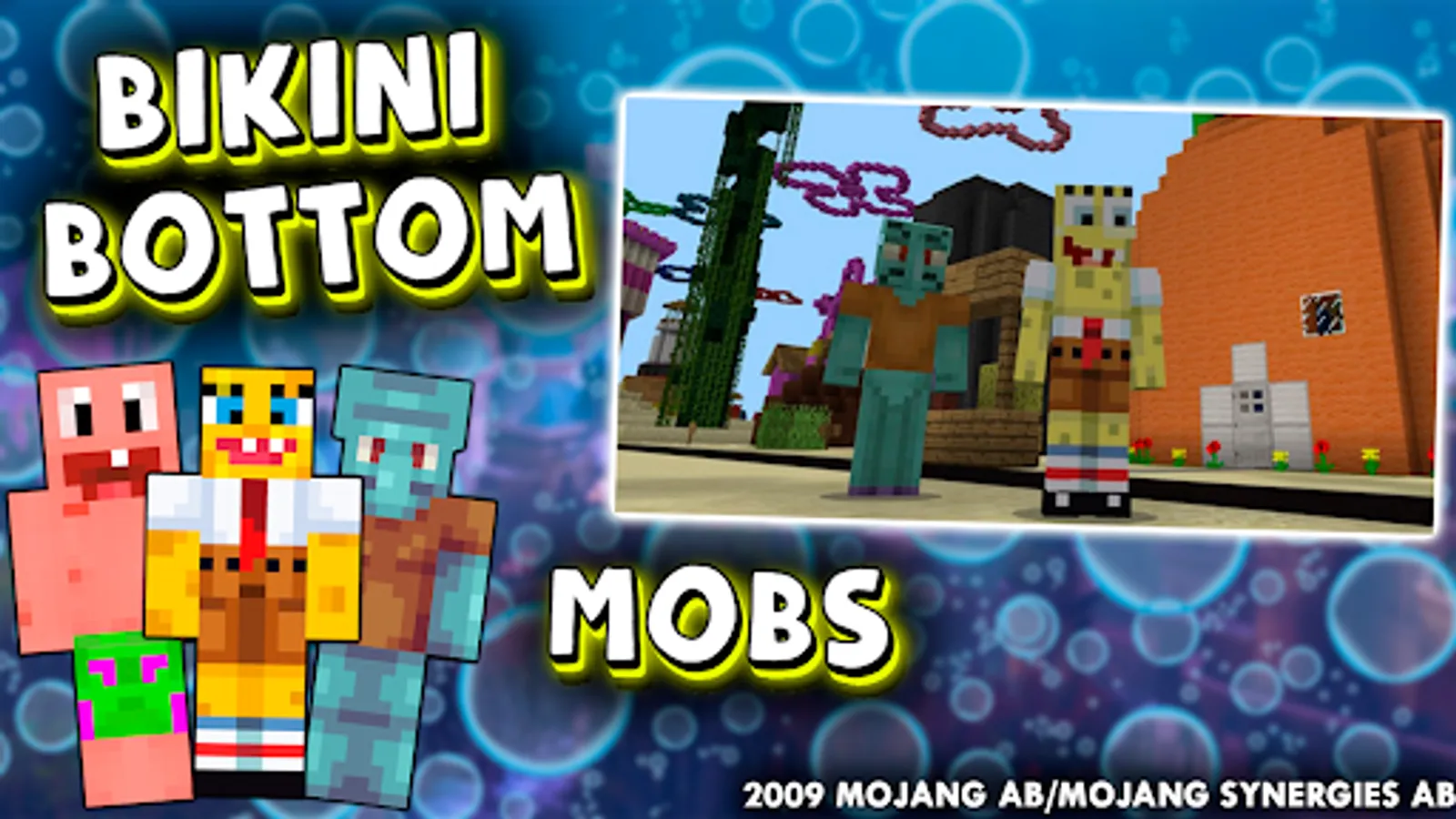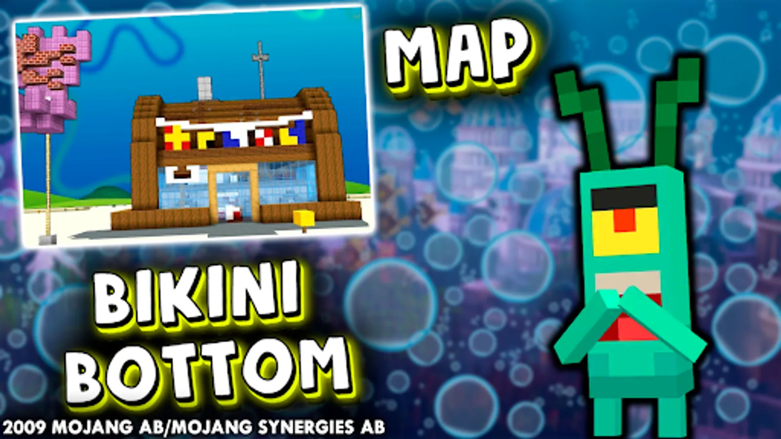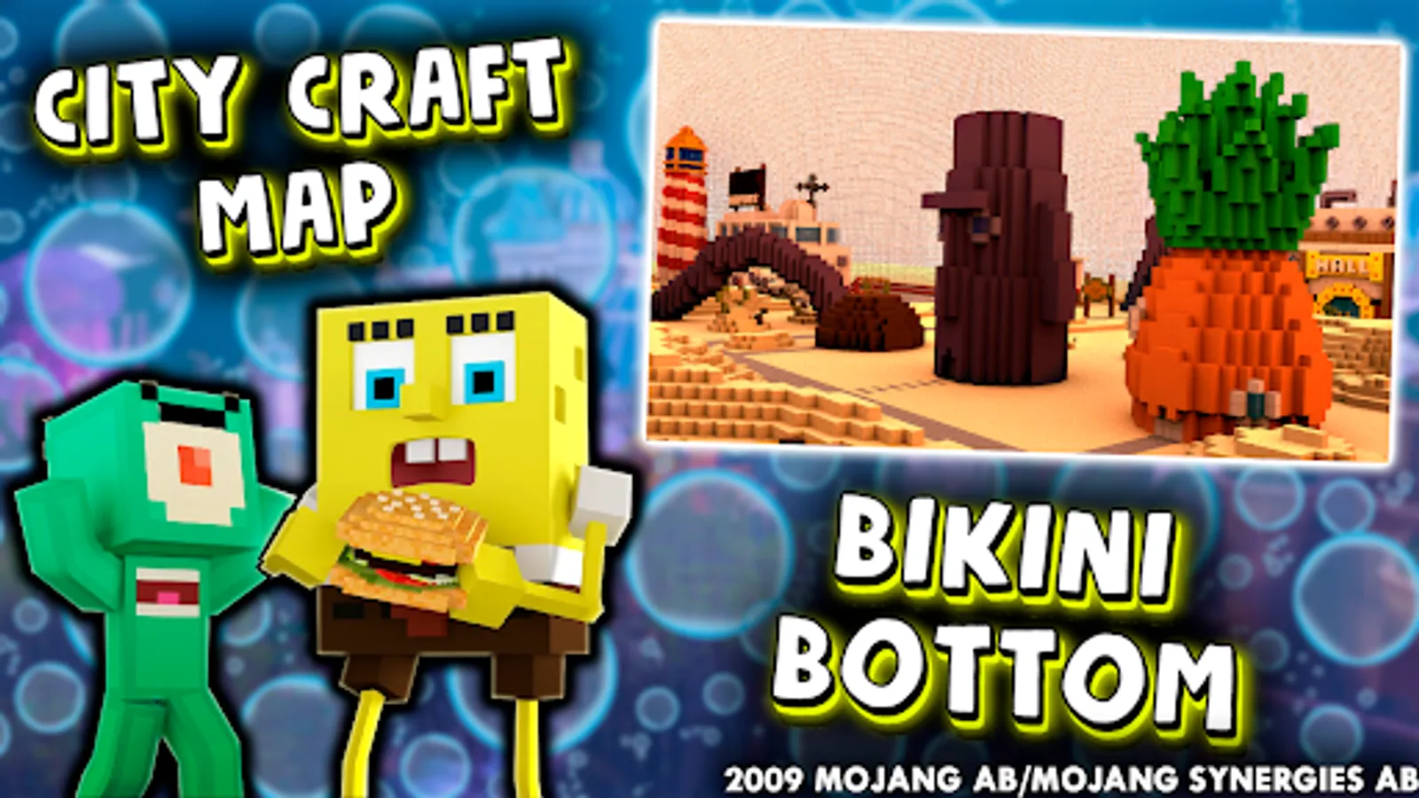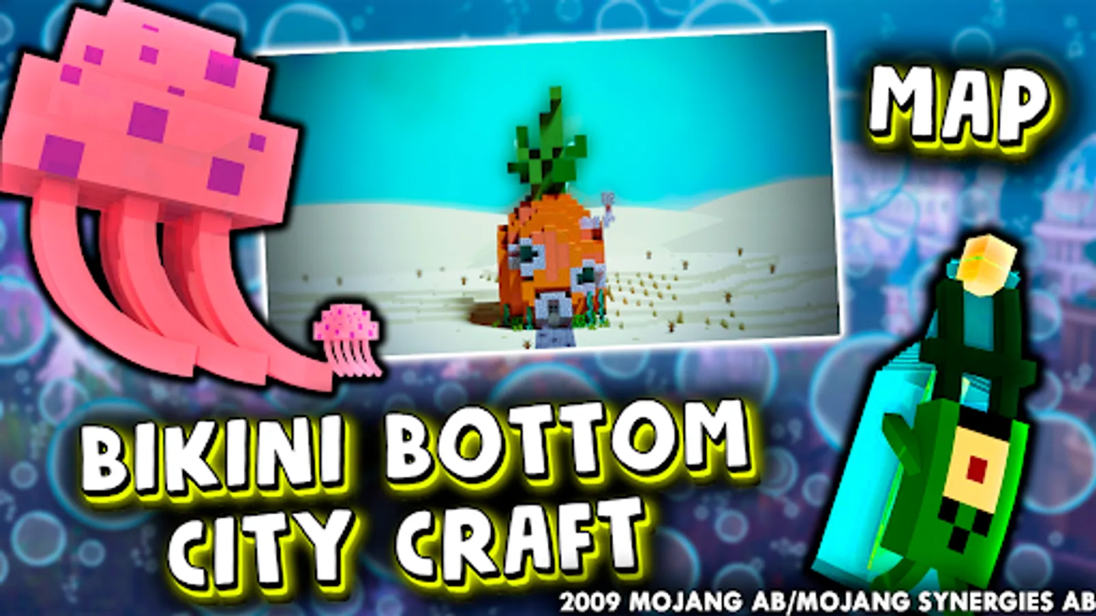 This is a pe craft game survival map based on the famous Bikiny bottom city. This craft map is based on crafting and cubic blocks in voxel handheld games.You can build and create - in the big city. Now you have the opportunity to explore this famous city in the pixel cube world. You have the opportunity to live in pineapple house or craft your house or shelter from cubes, fight or interract with other members of bikiny city, assemble your team and explore the areas of the cube city. Building houses game with FPP (First person in perspective). Great game for boys and girls! Be creative in this blocky lightweight game. You can go the fast crasty crab food restaurant with your friends in the game. Together with your team you will need to mine, resources, food, water, build all you want and need in this craft map from the blocks.
