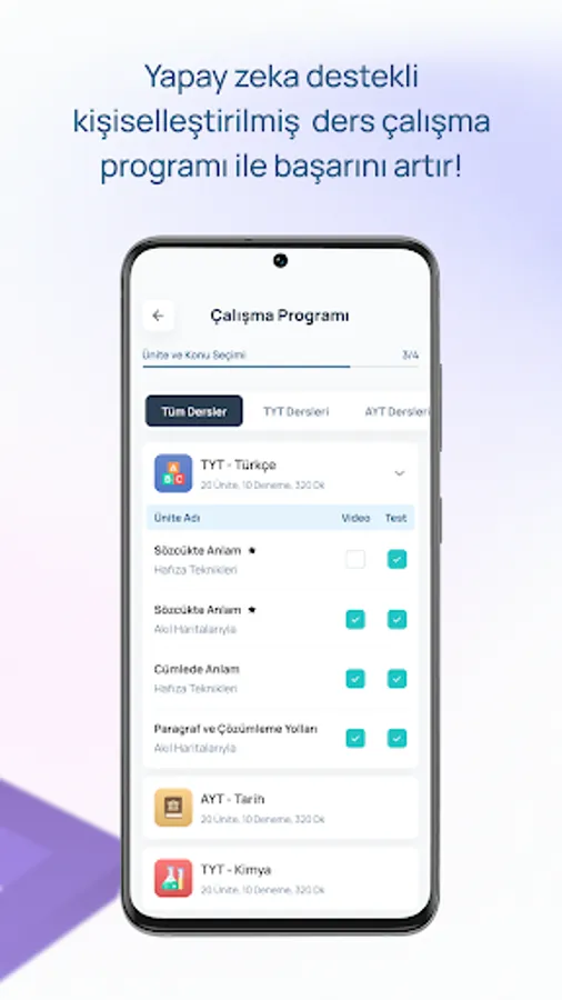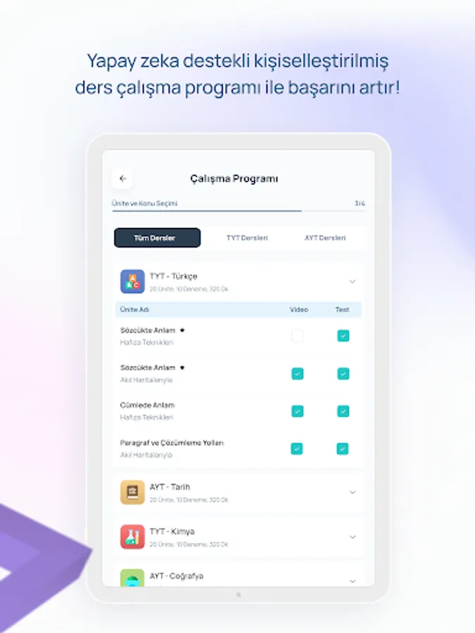 With artificial intelligence technology, you can create your own personalized study program. You can identify the subjects you are missing and your daily study time. You can watch alternative videos with lectures by many different teachers to learn about the topics you are missing. If you do not understand the subject in detail, you can connect to the lecture, where you can have a one-on-one interview.