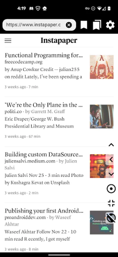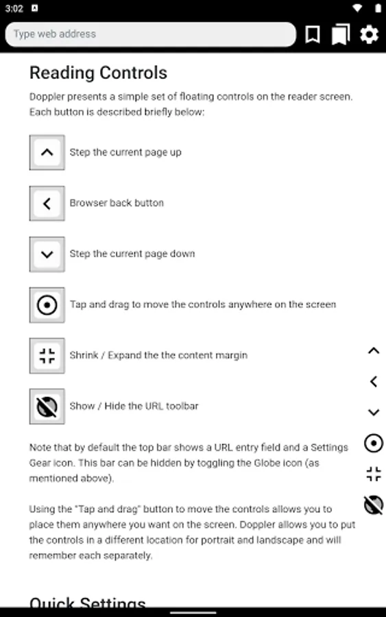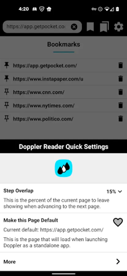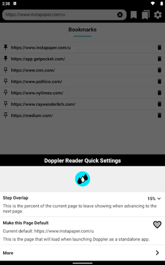 Doppler Reader is a simple browser that is built to enhance the experience of reading the web on E Ink. Doppler presents controls that allow you to step through web articles one screen length at a time. This approach is a more natural experience on E Ink, and allows you to read faster while keeping a more comfortable and casual hold on your device.