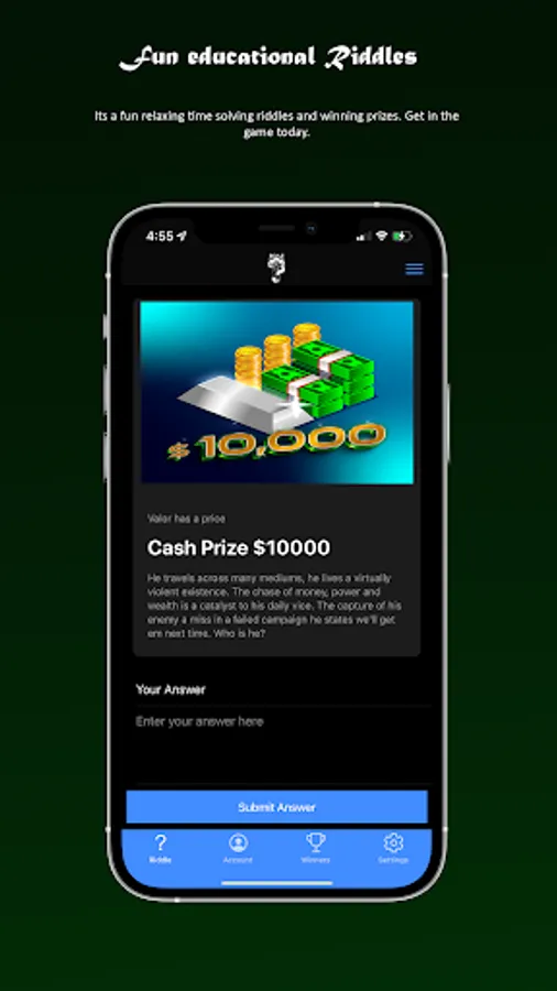 The goal is simple and fun, download the app now try to solve a riddle that can be simple or very complex. If you are the first to answer correctly you win that prize. Prizes can be cash up to $1 million or items such as a new car, electronics, a house etc. Each riddle can come with any range of prizes. Jump in today and challenge yourself to a riddle and see if you have what it takes.