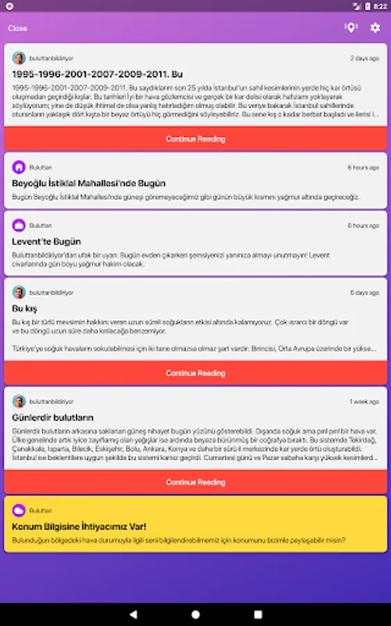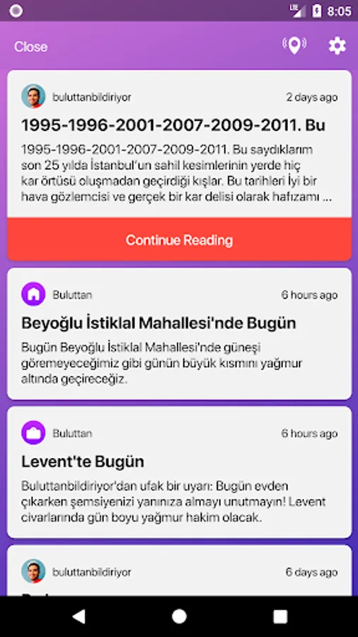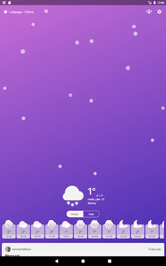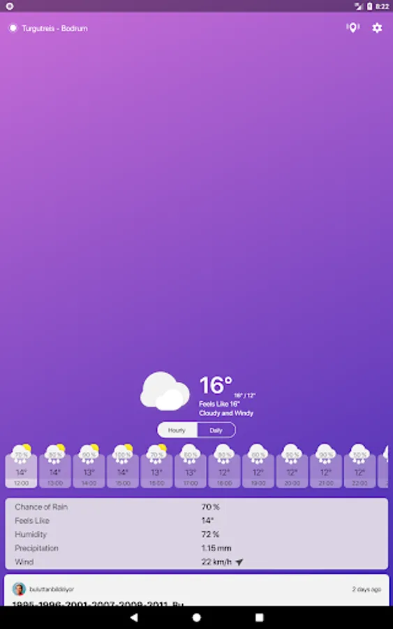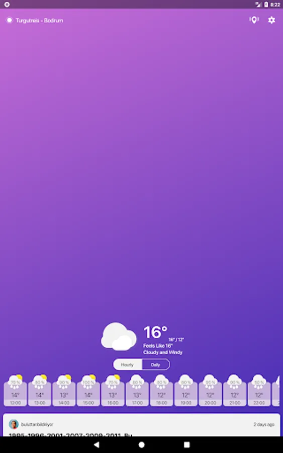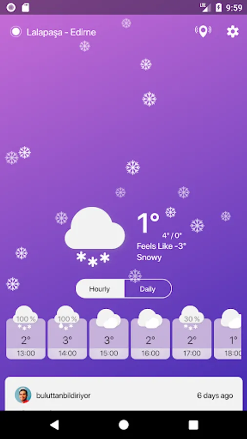 The Facebook page buluttanbildiriyor reaches thousands of people each day with its accurate weather forecasts. It now has an official app on the Play Store: Buluttan! Buluttan lets you check the hourly and weekly forecasts of any neighborhood in Turkey, share the current weather conditions with other users, get notified of any extreme weather events and read the latest posts in buluttanbildiriyor Facebook page!