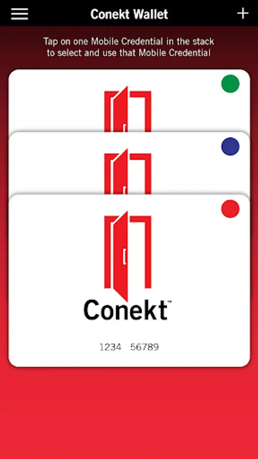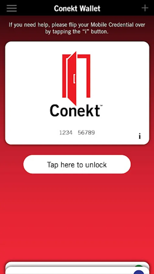 The Conekt Wallet App is designed to operate on an Android-based smartphone, and in conjunction with electronic access control systems making use of Conekt mobile-ready readers. It allows a system user to download, manage and hold their mobile credentials in a simplified manner. With the app enabled and valid mobile credentials loaded, an Android-based smartphone user may enter into any authorized access system.