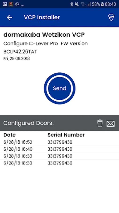 With VCP Installer App you can install a configuration package in dormakaba door components using the smartphone. For the communication, interfaces such as Bluetooth Low Energy (BLE) or Near Field Communication (NFC) are used.