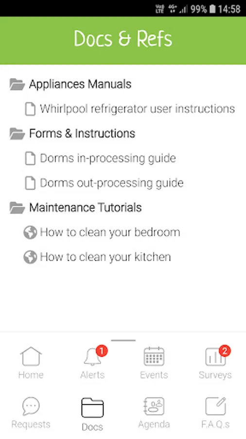 Mobile application for campus residents (military dorms or university campus) meant to be used within the DormsNet environment. Easily receive emergency alerts and events notifications, send requests to facility managers and consult phone directories, forms, how-to videos and any other document made available by the facility management through a back-end application.