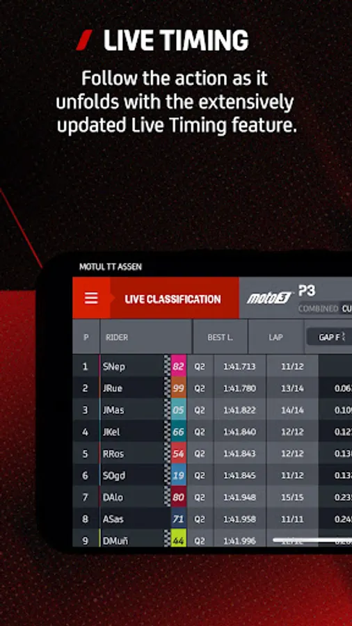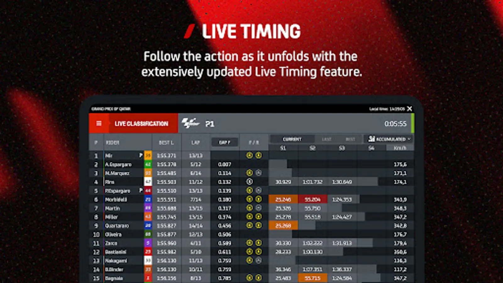 Follow the action as it unfolds with the extensively updated Live Timing feature, and watch lap times progress as the riders speed through each sector of the track. Split times, sector tracking and exclusive data allows you to see exactly how the riders are performing throughout each lap and chart the riders as their teams and mechanics do. Available to you LIVE!