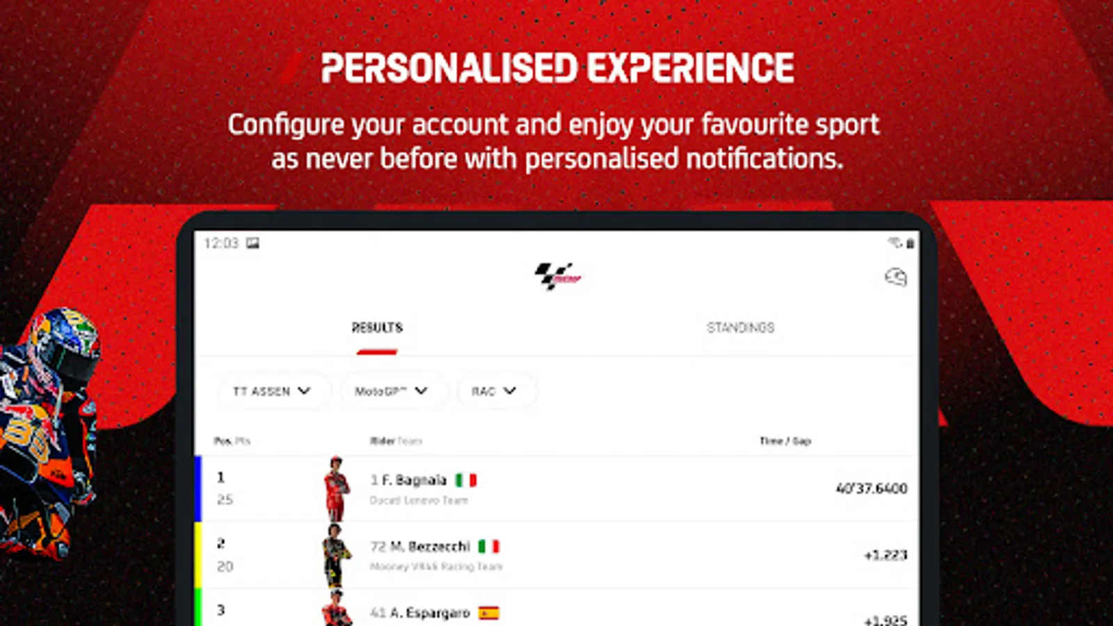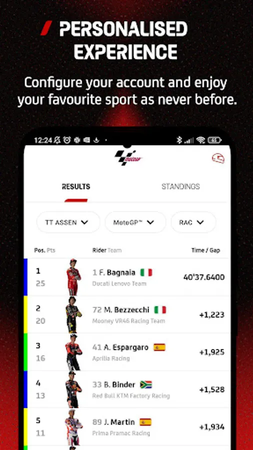 Stay in the know about your favorite riders with ease! Keep a close eye on all the news surrounding the riders you support the most. Stay up-to-date with their latest results, standings, and never miss any updates again. With the MotoGP™ Official App, you'll never lose track of your favorite riders. Stay connected and be the first to know!