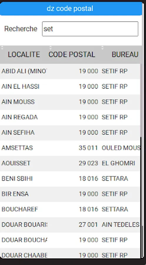 Cette application vous permet de trouver le code postal de n'importe quel localité en Algérie, ou l'opération inverse, trouver les localités à partir du postal code.