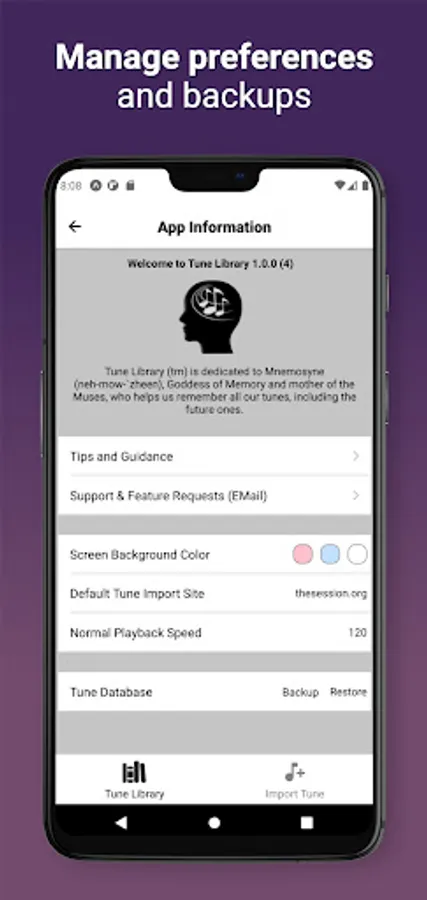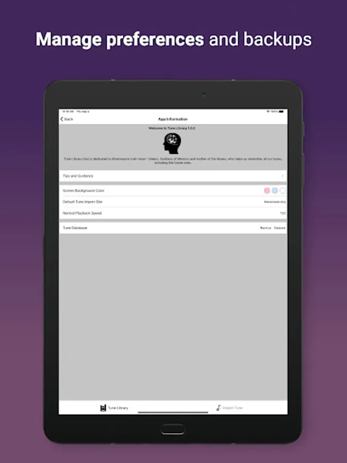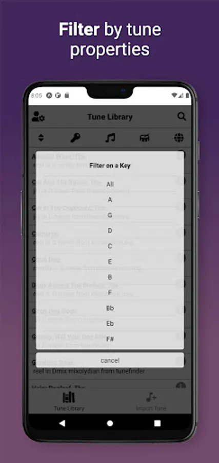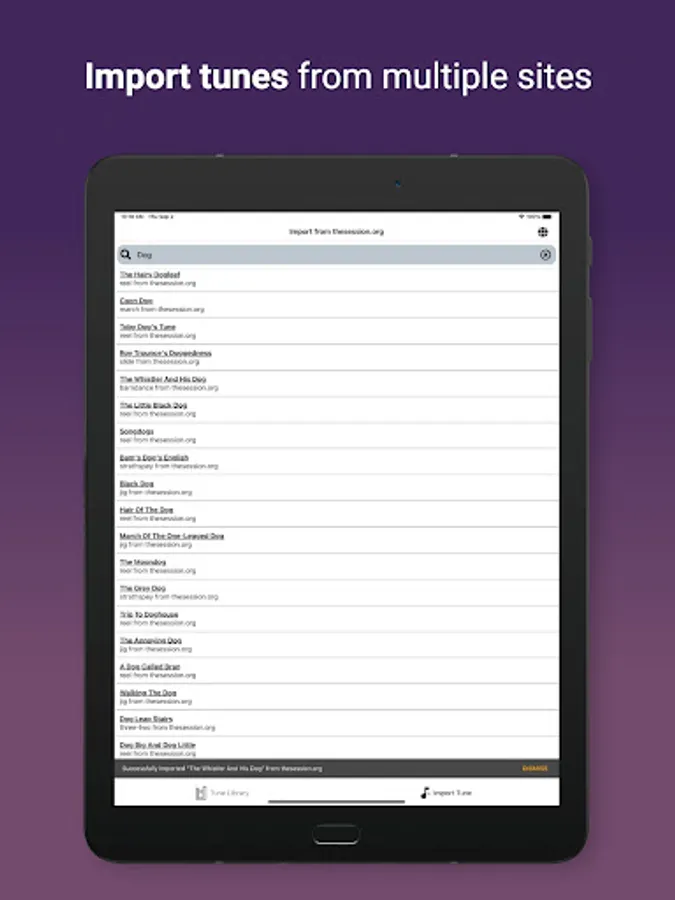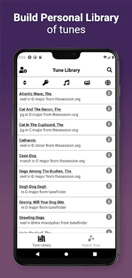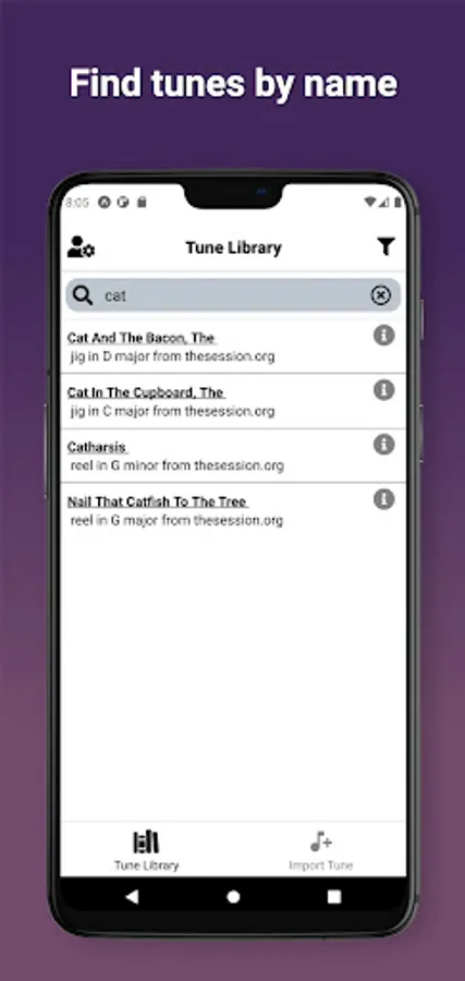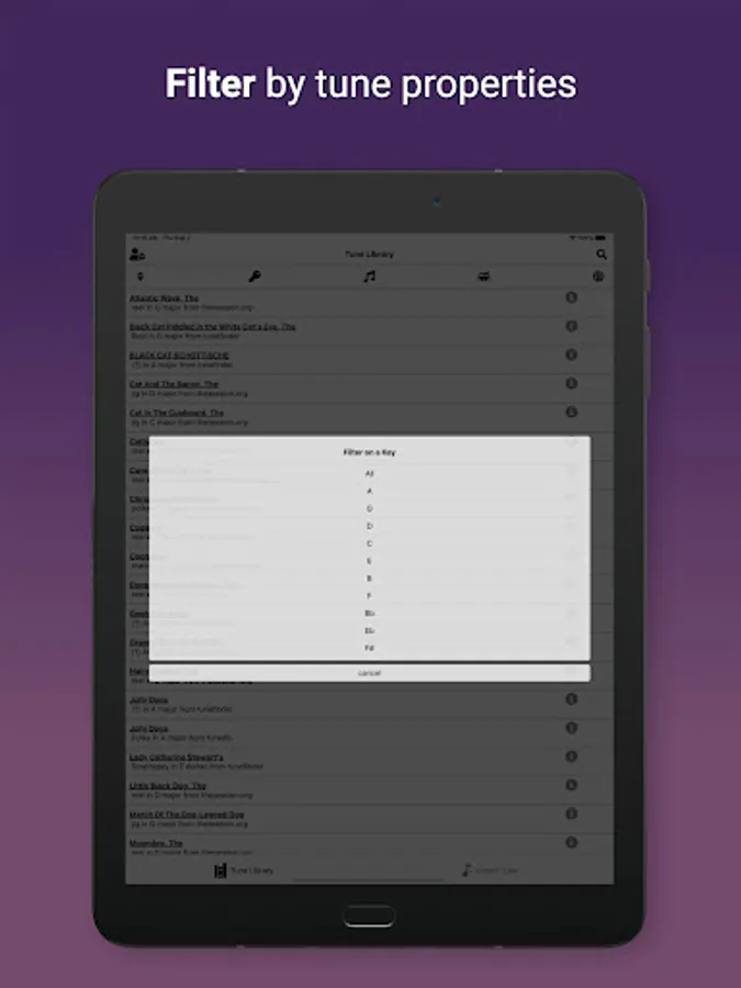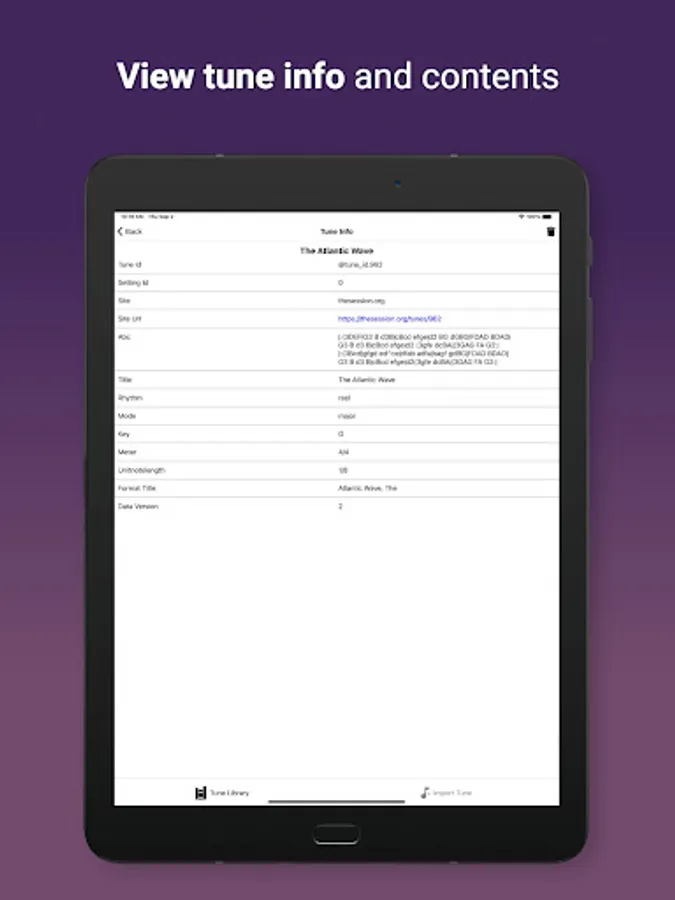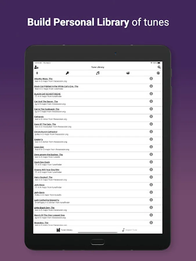 Tune Library helps you find and remember your tunes for a practice, jam or session. Import your repertoire from a range of supported tune sites, then quickly locate tunes as needed by rhythm, mode, key, name, etc.