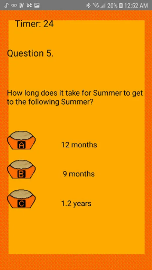 I know most people are too lazy to learn, so each quiz is only 10 questions long. The first level starts off with a 30 second(approximate) timer. The more you progress, the less time you have to finish.
