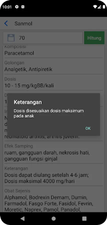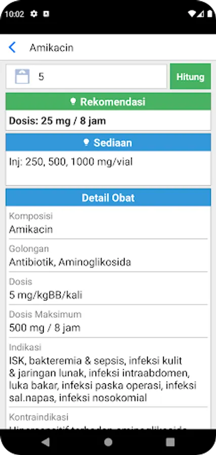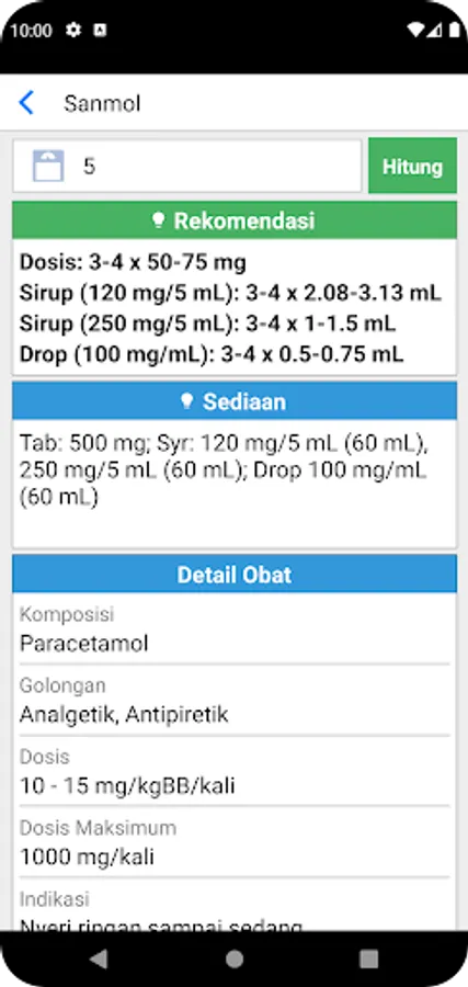 This application provides a calculator that facilitates the calculation of child drug doses with a complete database for oral, injection and topical medications. By entering weight, the application will provide recommended drug dosage information in accordance with reliable references, limiting the dose according to the maximum dose for children, providing available dosage information, providing information on indications, contraindications, and brands of similar drugs in Indonesia.