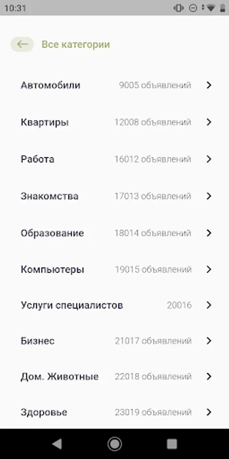 Catalog of announcements includes the following sections: Real estate; Work; Cars Services of specialists; Education; Pets; Business; Children; Transportation; Relaxation; Work; Miscellaneous.