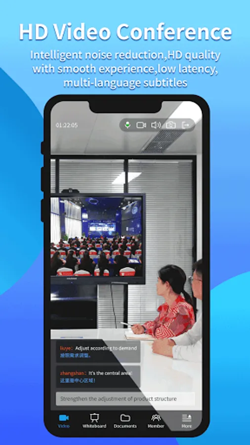 High-definition display of the video of participants from various venues, support 112 languages to participate in the meeting at the same time, and use subtitles for translation and display. .