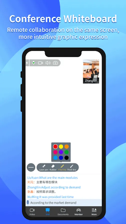 Shared whiteboard supports sharing whiteboards on the same screen in different places for discussion, and supports simultaneous writing on the whiteboard by multiple parties.