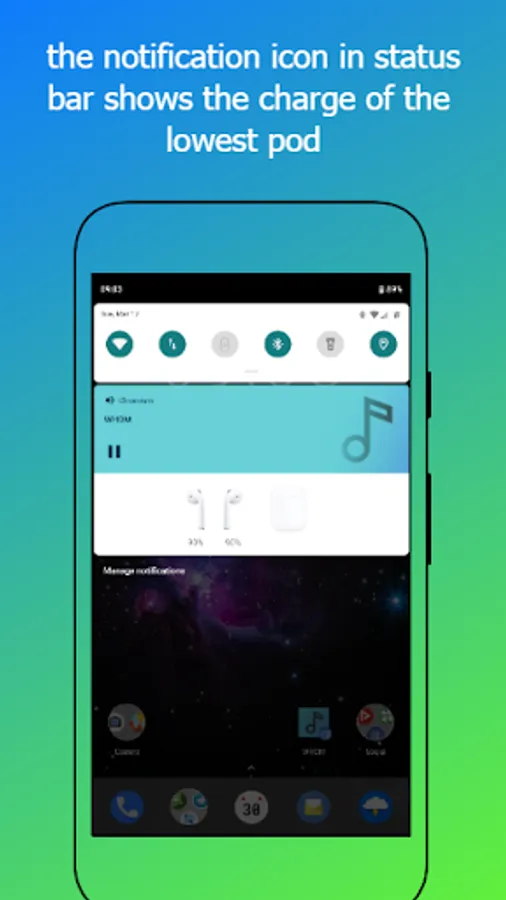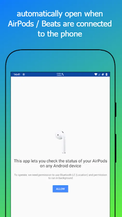This app displays the current battery level of your connected AirPods generation 1 and 2 in a live notification and/or a small pop-up.