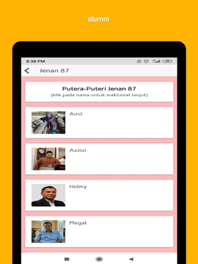 Aplikasi ini dibangunkan sebagai sumber pengumpulan maklumat alumni Jenan 87 bagi tujuan rujukan untuk memudahkan komunikasi sesama ahli.