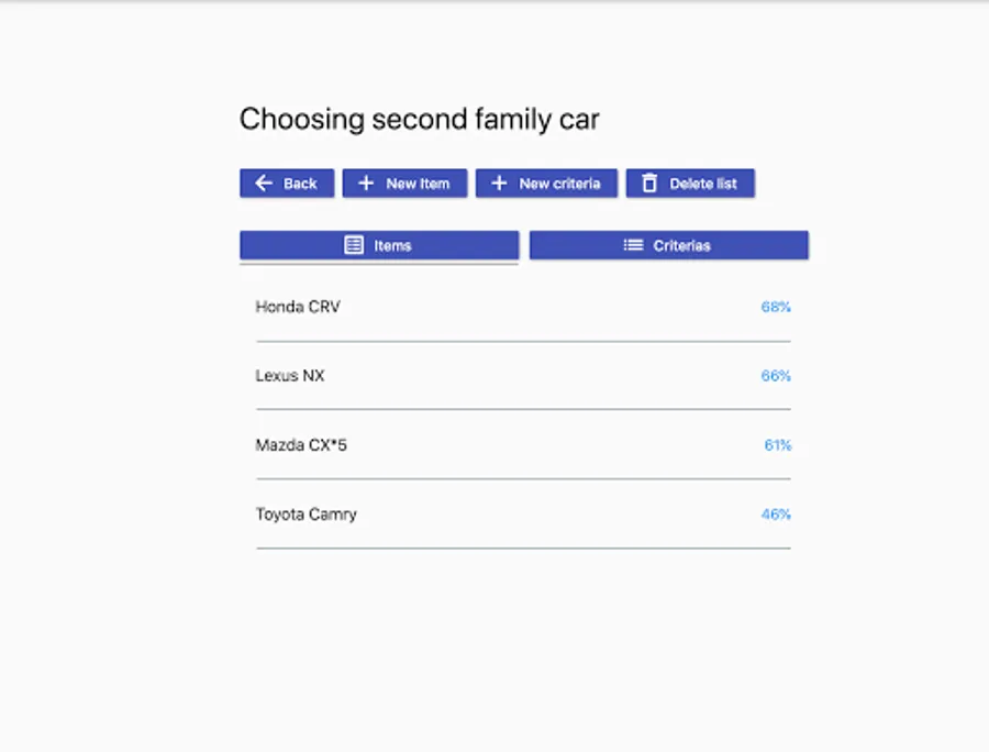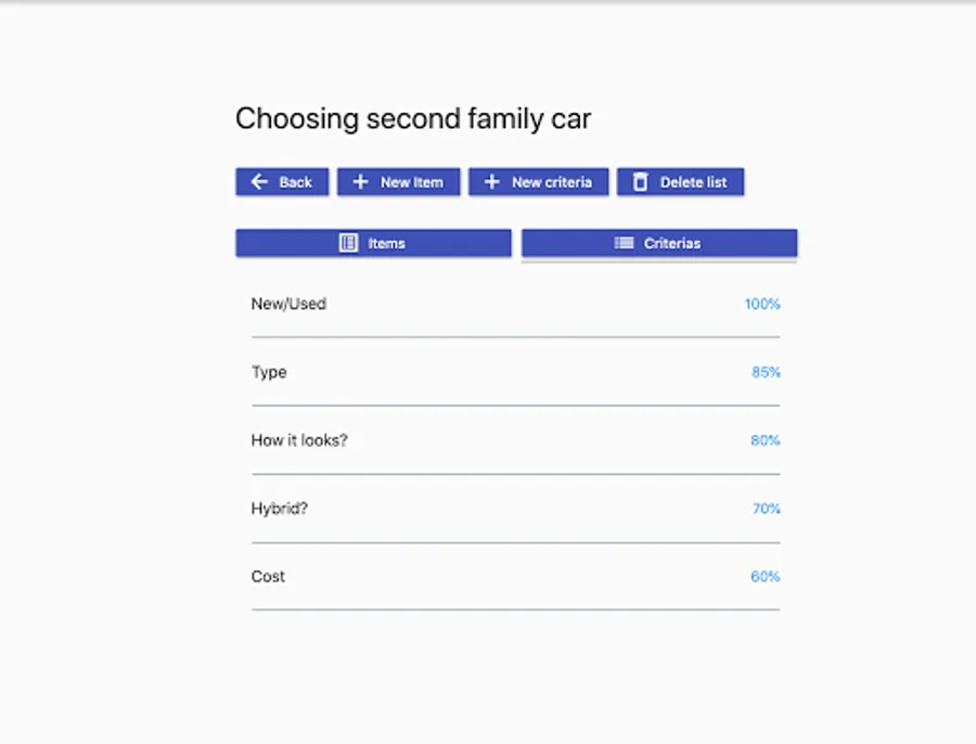 With the free Priority Decisions online tool you can make rational choices in an instant. You simply fill in all choices that you have and objectivity weight all aspects that come with this choice. In the end you will have a prioritized list with all options with a simple percentage in which way each option fulfils your need. Finally you simply select the option with the highest percentage. Isn’t that easy decision making?