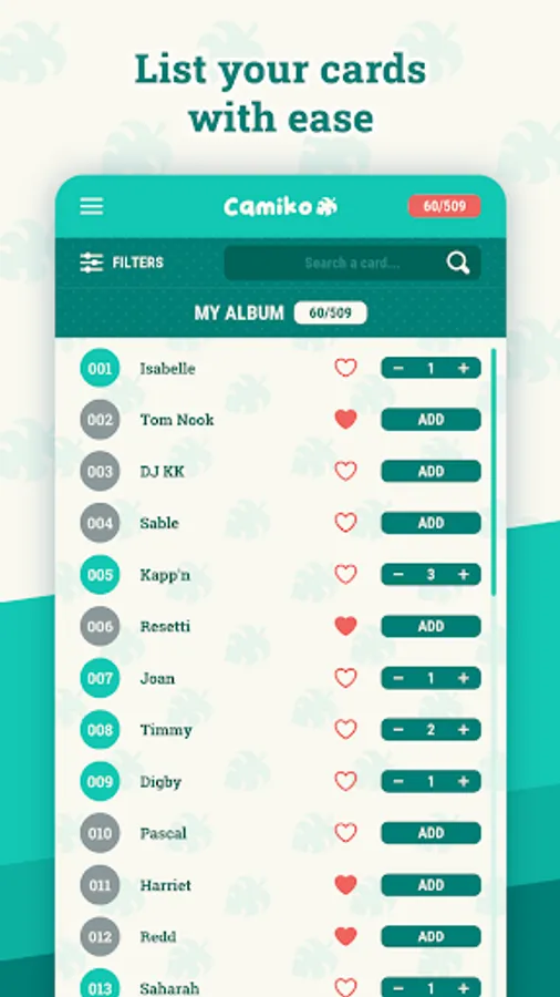Camiko is a non-official application to manage your Animal Crossing amiibo cards collection.