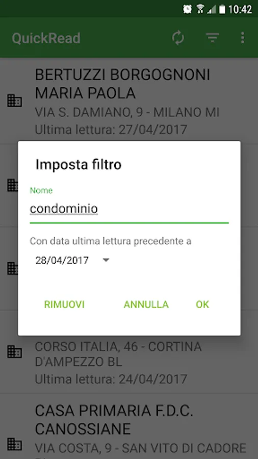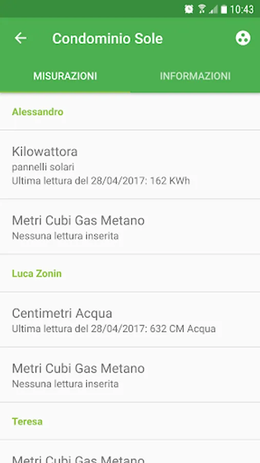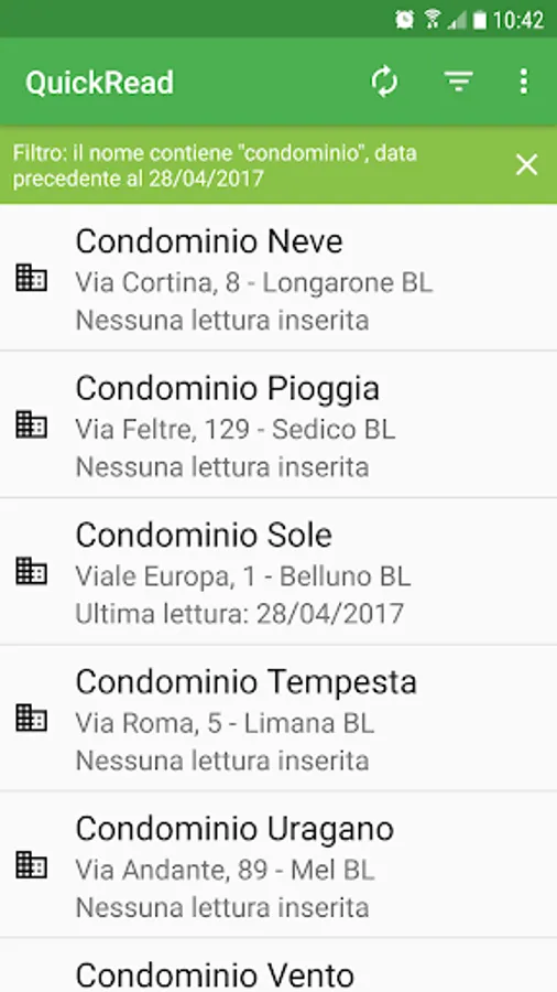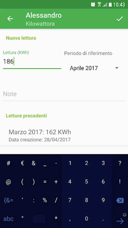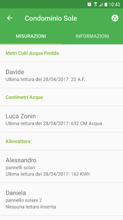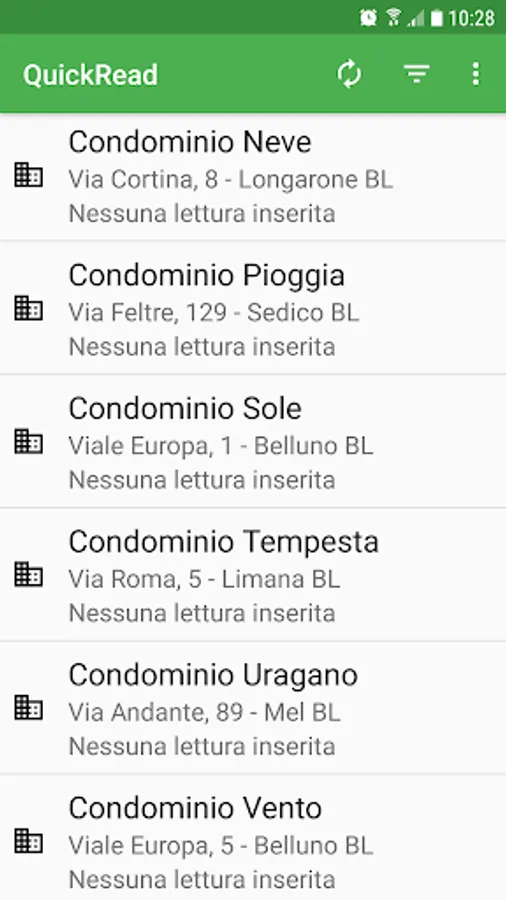 In the app, the meter reader may consult the buildings to visit with progressive previous readings and enter the measured values. They are provided for consistency checks (non-blocking) and the ability to annotate and highlight abnormal situations encountered during operations (eg. Change counter, not detectable reading, etc.).