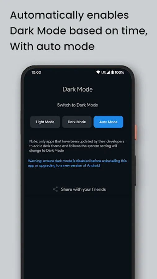 This app helps you to activate the Android Dark Mode on devices that does not provides this option in the system settings. Get support for Night Mode in older devices.
