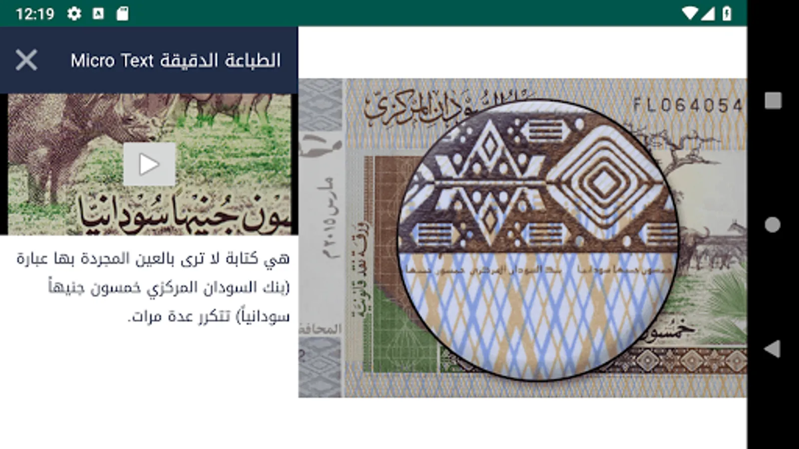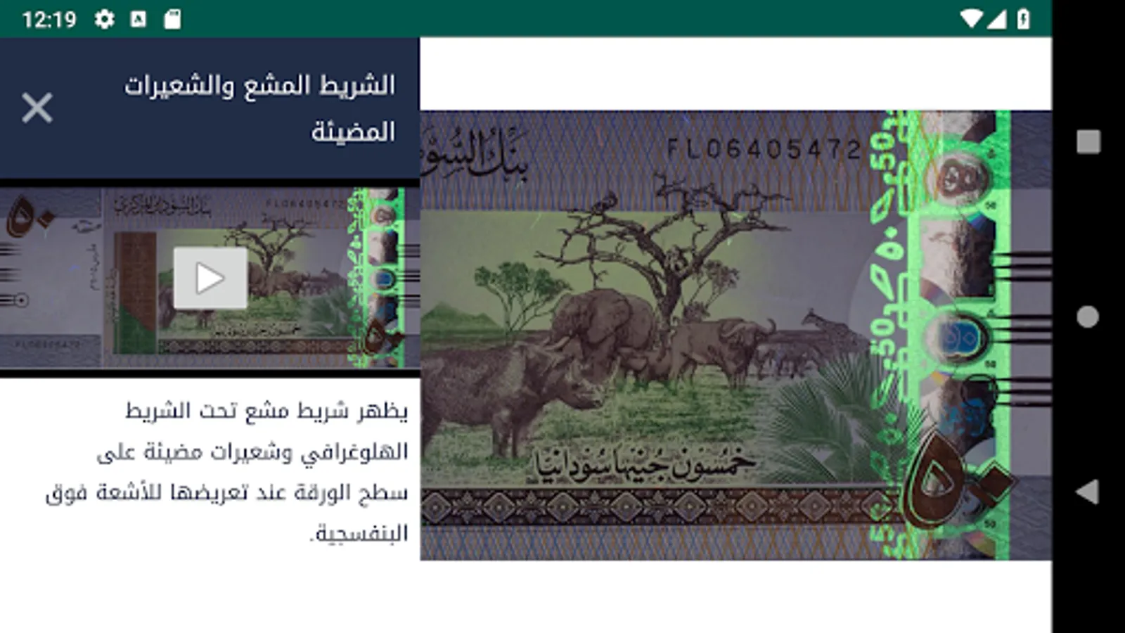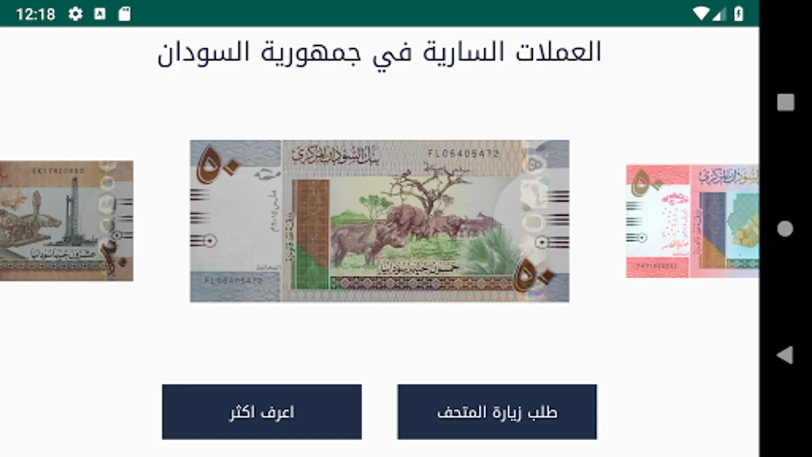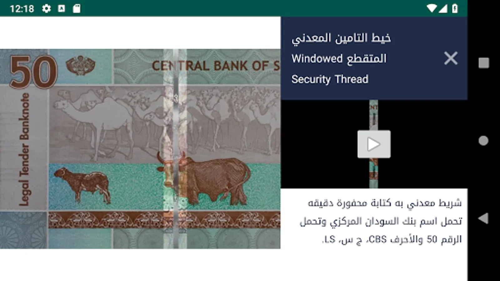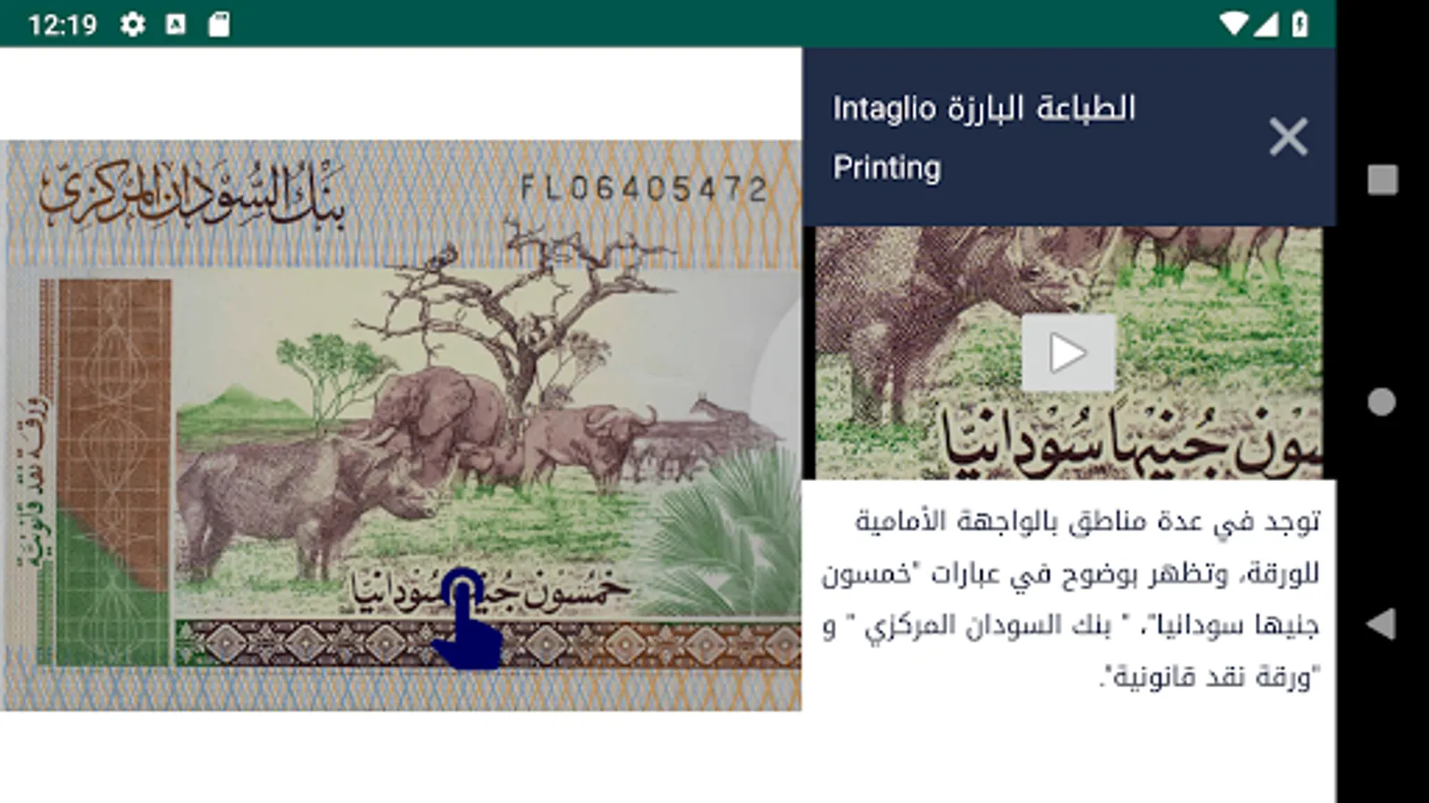 The (Sudanese coins) app is an interactive tool to display the specifications of the current Sudanese banknotes, and enables the user to identify the security features of the banknotes, including the new series that issued in and after the year 2019,