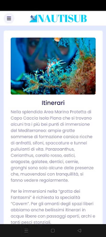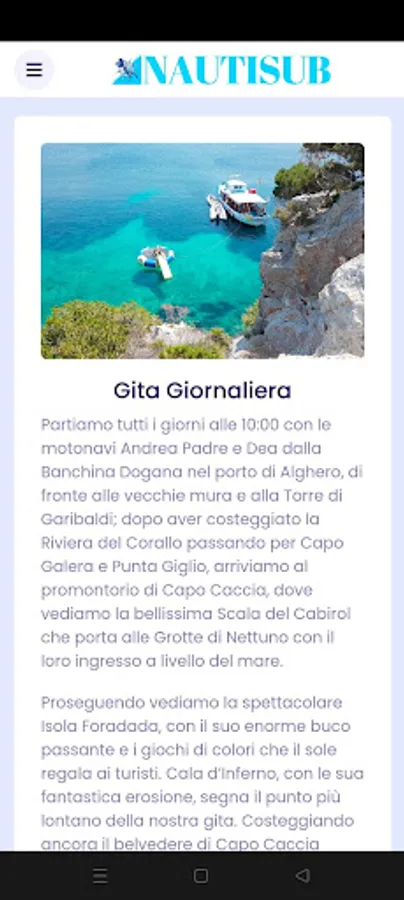 As for the Diving Center activity, Nautisub can boast the Andrea Padre, an 18-meter passenger transport motor ship with a capacity of 60 people that makes day trips in the fantastic Porto Conte Regional Natural Park and in the Capo Caccia Marine Protected Area. - Isola Piana, with lunch on board based on typical local products, snorkeling in beautiful bays full of curious fish and semi-submerged caves with plays of light that leave you breathless.