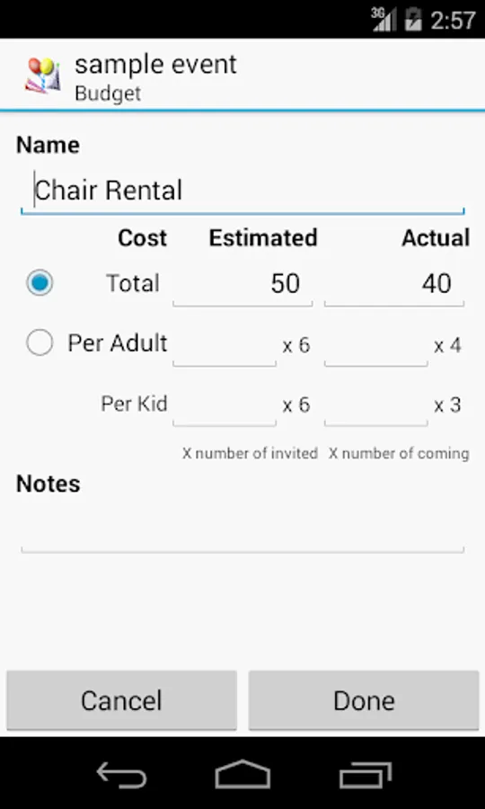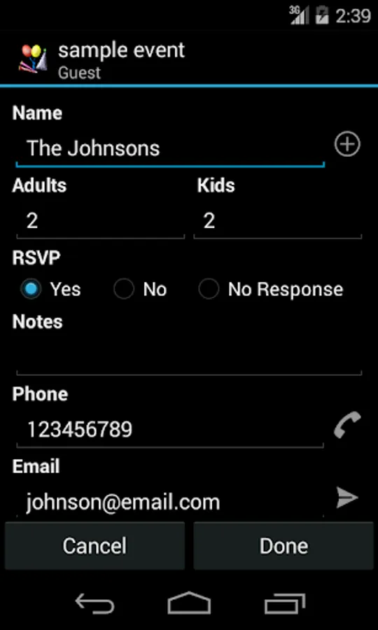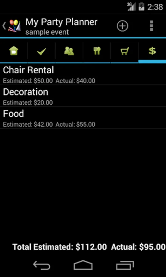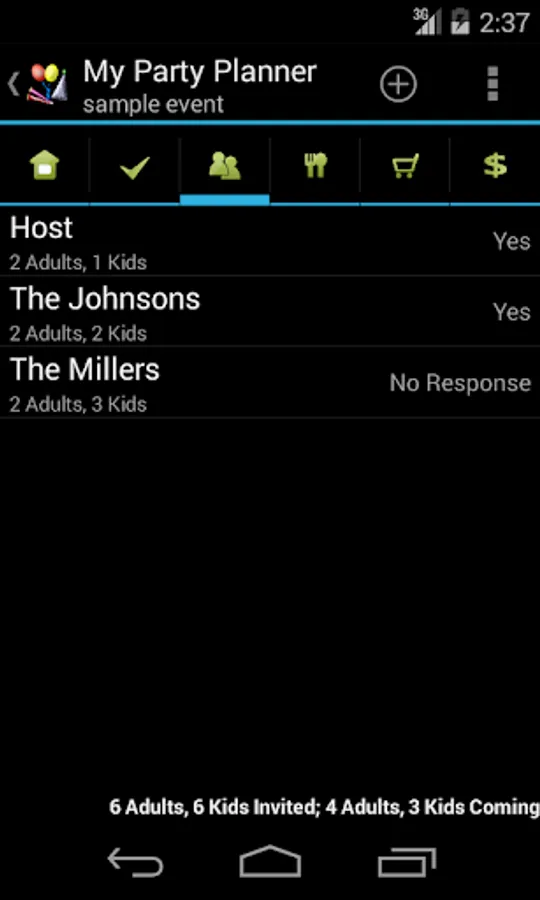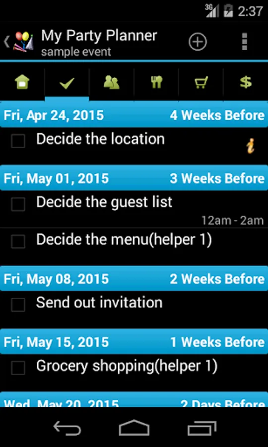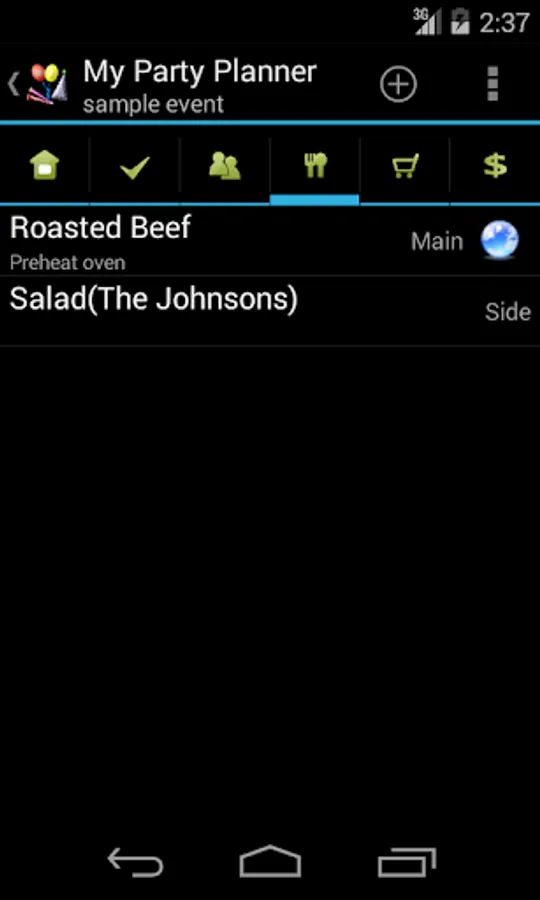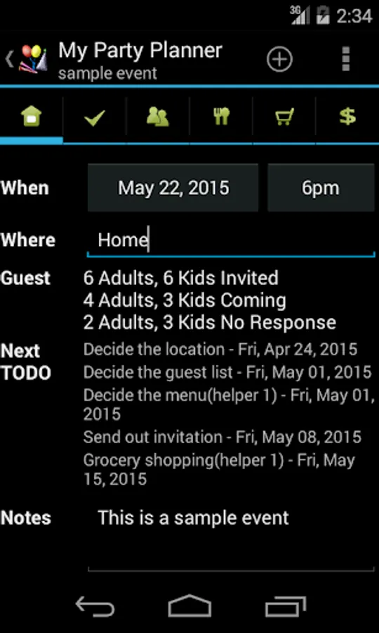 My Party Planner helps you plan parties and events. It has five sections: "TO DO", "Guest", "Menu", "Shopping" and "Budget" in addition to general information.