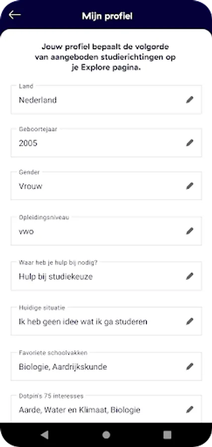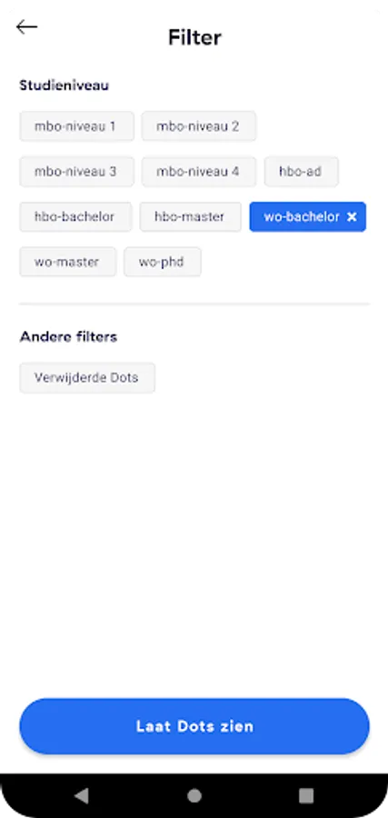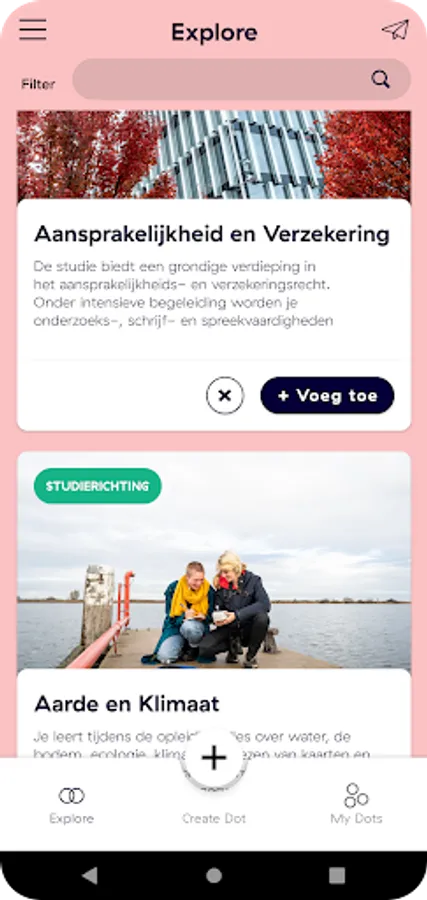 Dotpin werkt eenvoudig: tijdens het onboarden word je profiel aangemaakt waarbij je ons informatie geeft over je situatie en interessegebieden. Op basis van dit profiel geven wij je een Explore pagina waar je kunt zoeken naar de juiste studie. We noemen deze studies op Explore 'Dots'. Klik op de Dot voor meer informatie, klik ‘X’ als je het niks vindt en klik op ‘Add’ als het iets zou kunnen zijn. Je kunt ook een filter toevoegen om te zoeken op studieniveau.