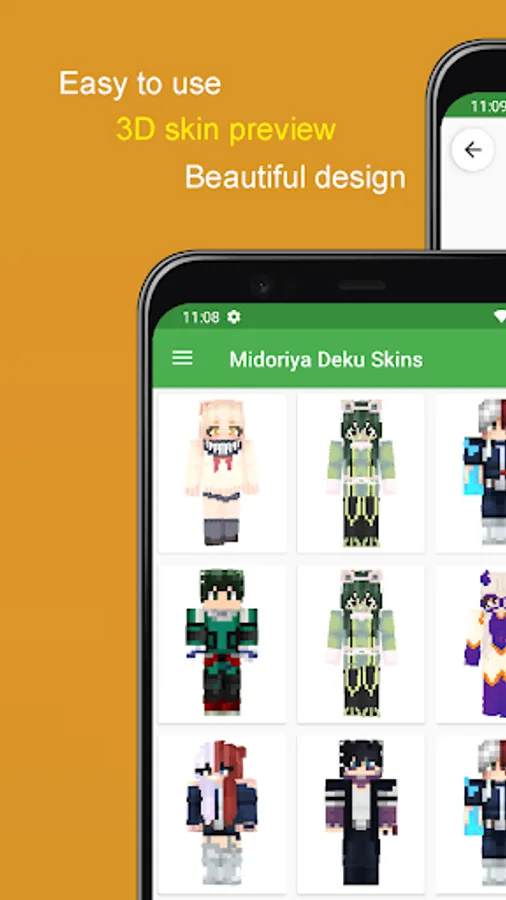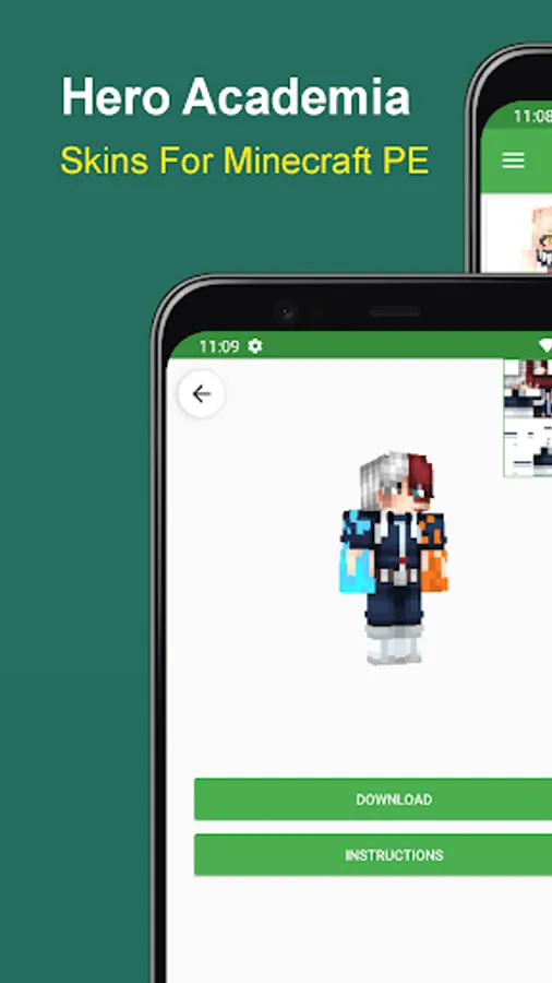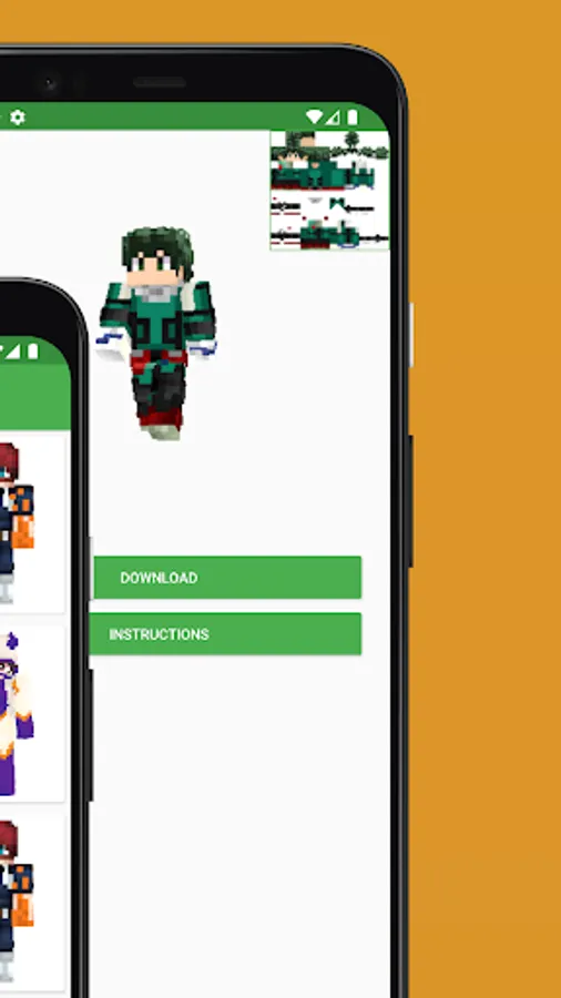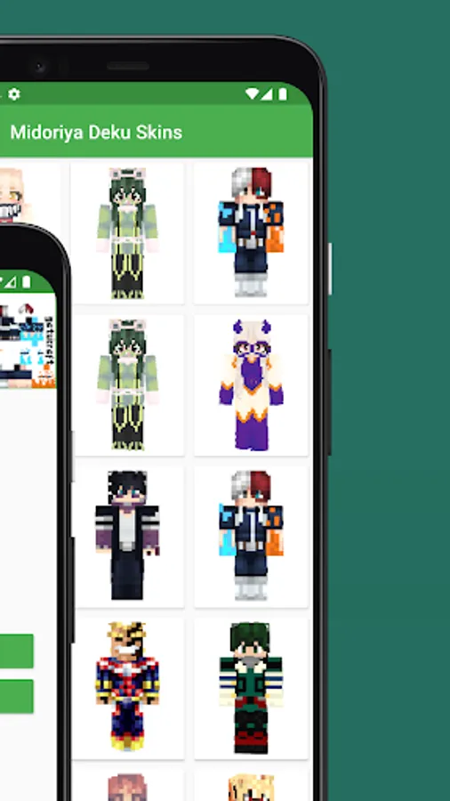 Great skins of your favorite My Hero Academia characters all wrapped in one single pack application. The easiest tool to get midoriya deku minecraft skin on your phones or tablets, easy way to change skins for your MCPE by using single tap button.