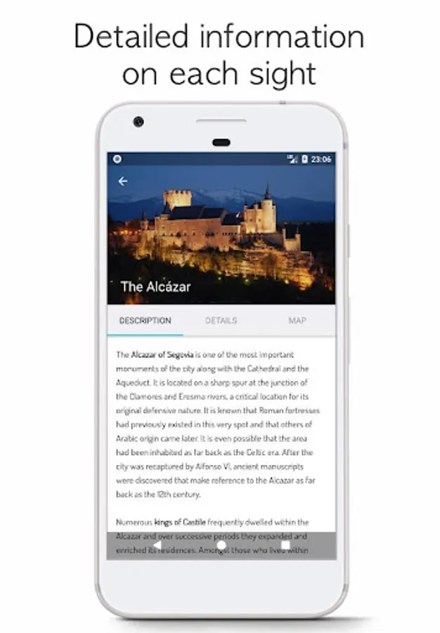 Sights 2Go Segovia is a complete travel guide that you can carry with you on your phone. It's a smart city guide that helps you find Segovia's most worthwhile sights and popular attractions, detailed walks around the city, best accommodation in city, essential information for your trip and more.