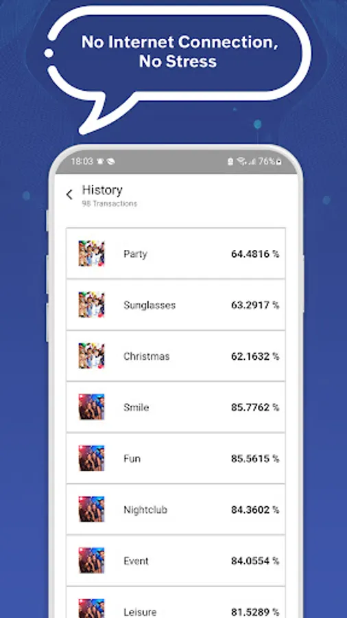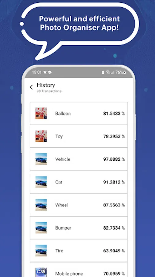 The history icon in front of the ‘album’ will take you to a screen where you will see images listed with the objects extracted from them along with their probability.