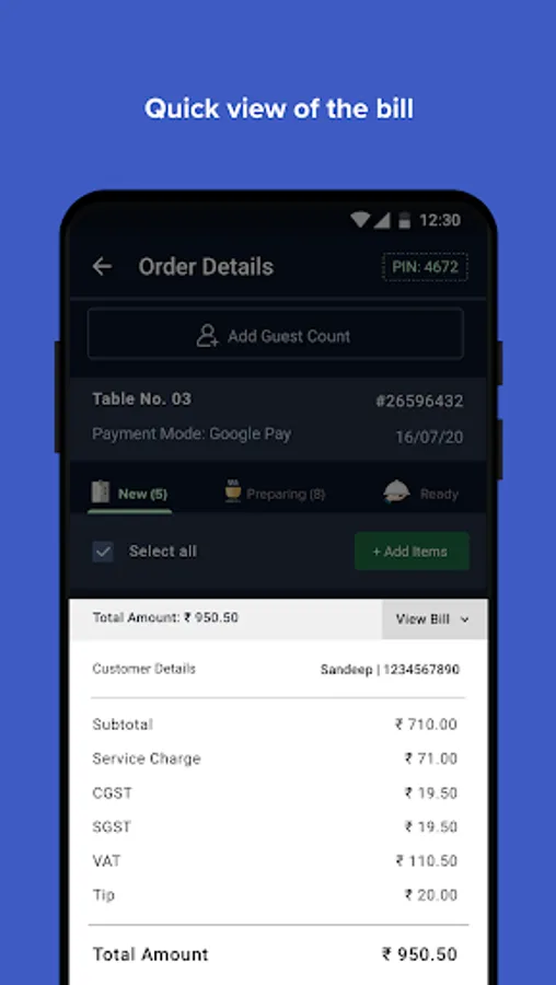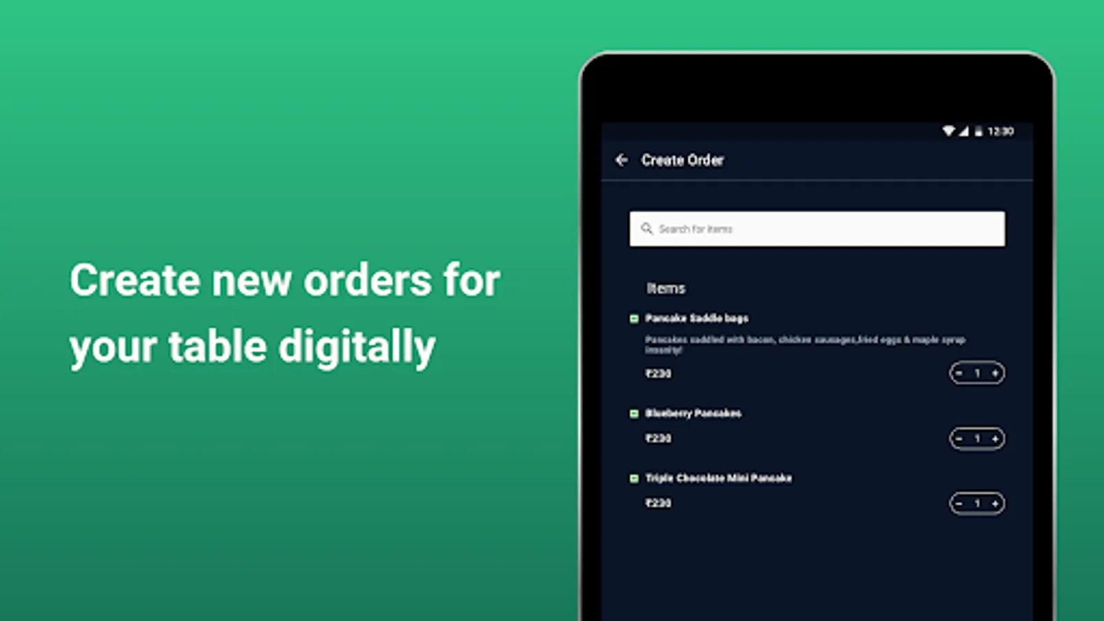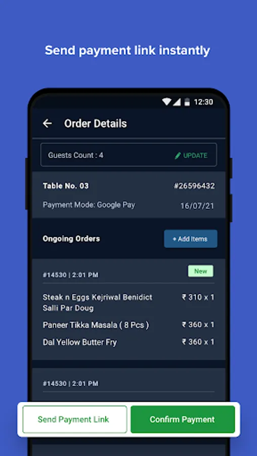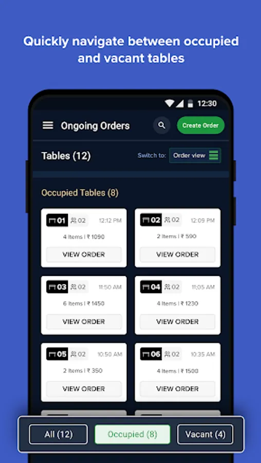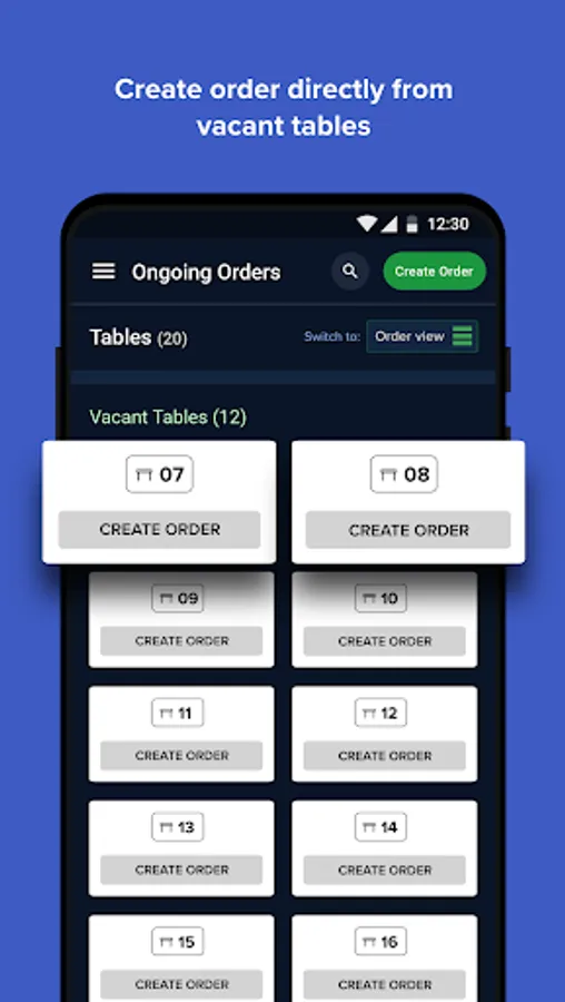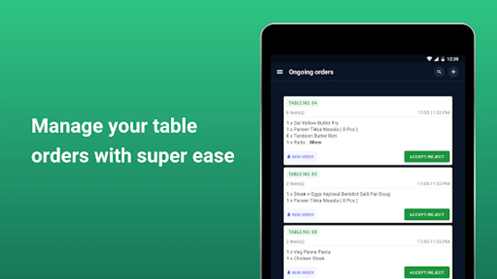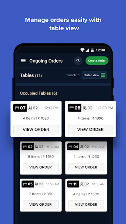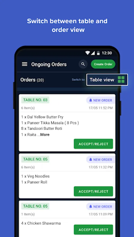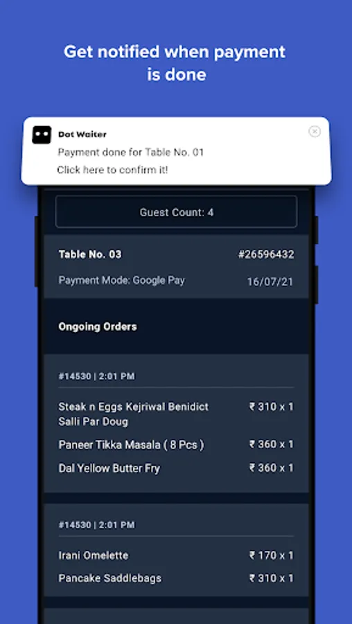 Manage orders via table/order view. Accept/Reject orders, create offline orders directly from Dot Waiter. Receive payment notifications, bill approval, table management, table switching, and more.