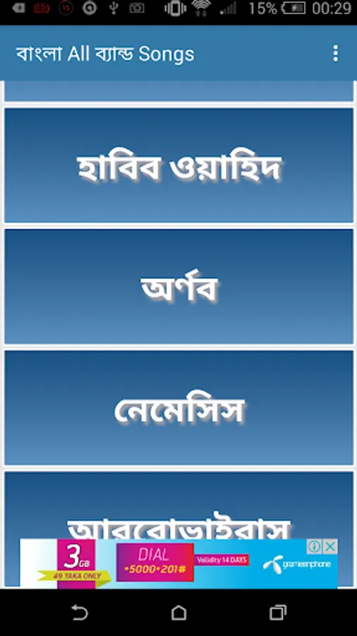 Shironamhin ,Aurthohin,Nagordola ,Lalon Fokir,Hridoykhan,Tahsan,Arnob,Miles,Black,Nemesis,Arbovirus ear গানের সমাহার।