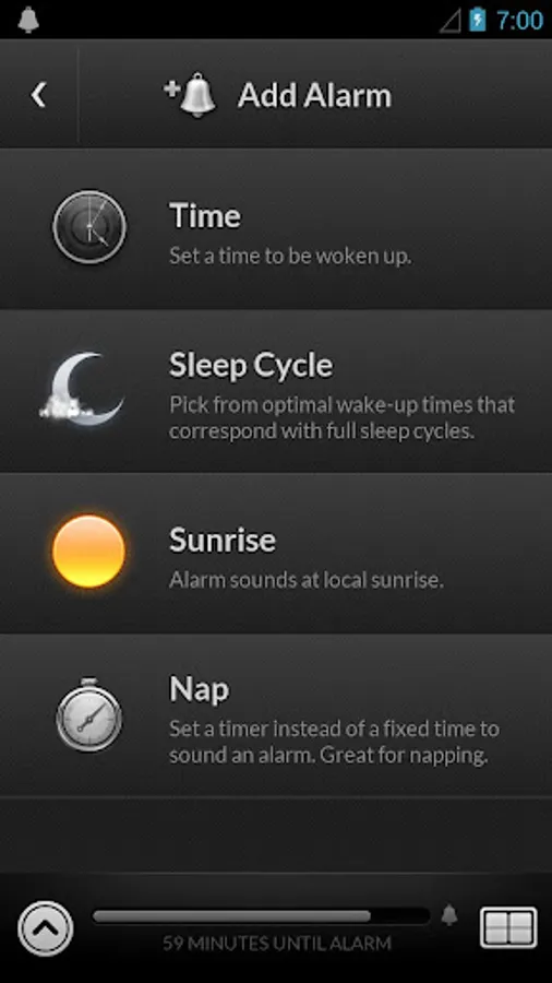 • Set alarm through one of four modes: Time, Sleep Cycle, Quick Nap, or Sunrise. Sleep Cycle helps pick optimal wake-up times to correspond with sleep cycles.