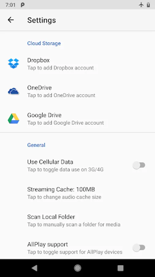 ♬ Download or stream music directly from your Dropbox, OneDrive and Google Drive without arbitrary restrictions