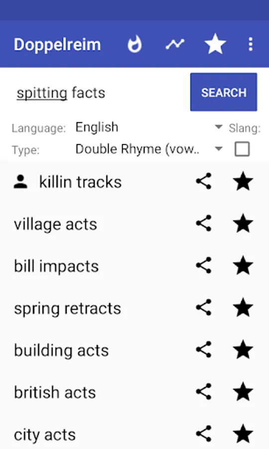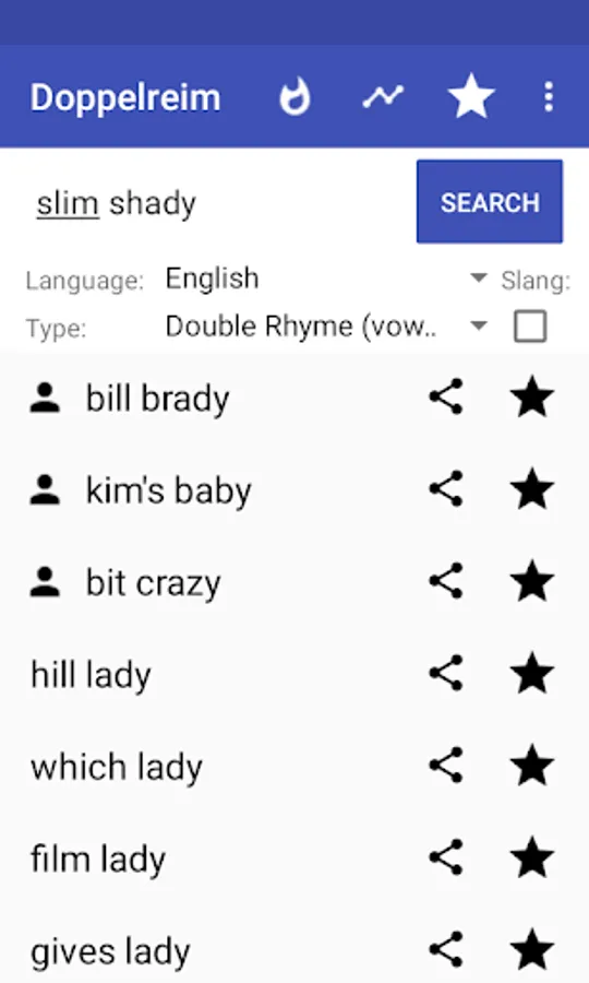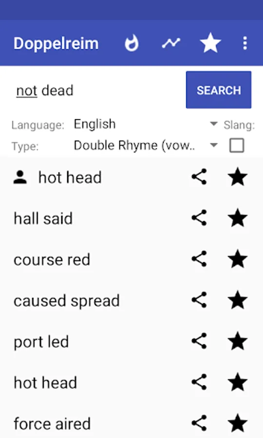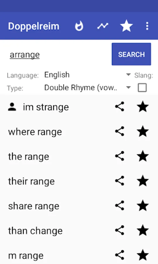 double rhyme is for free and it's very important to us that it stays for free, so that everyone can use it. Since we put a lot of computation power in our rhyme generator, we have quite high server costs.If you like our project share it with your friends. That way, you make the Doppelreim app more popular. So, we can spend more resources in improving our rhyme generator and give you the best experience finding your multi syllable rhymes. As you see, there is enough space for improvement. But its only possible if you support us. Thanks!