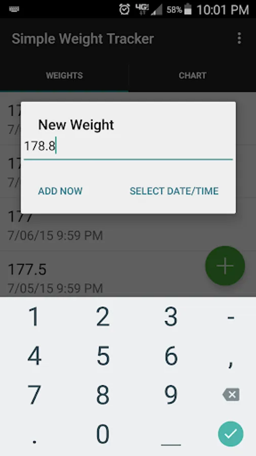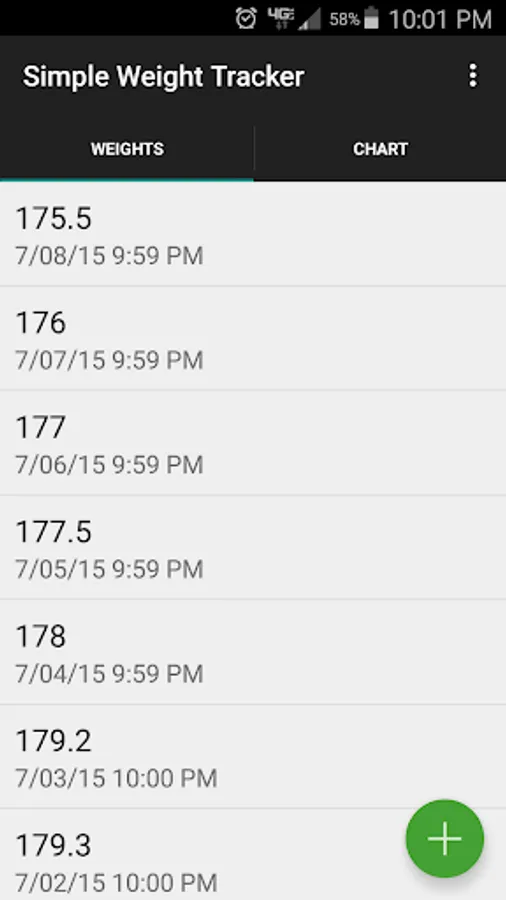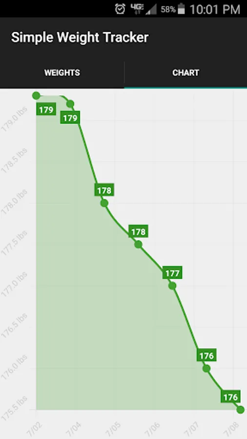 To use, tap the "add" button (bottom right corner) and enter your current weight, or weight at a different point in time. Tap "add now" or "select date" to select a different date than today. That's it. The weight tracker will list your weight and the date it was entered. To get an idea of how your body weight is changing over time, switch to the chart tab to see a simple line chart of your progress.