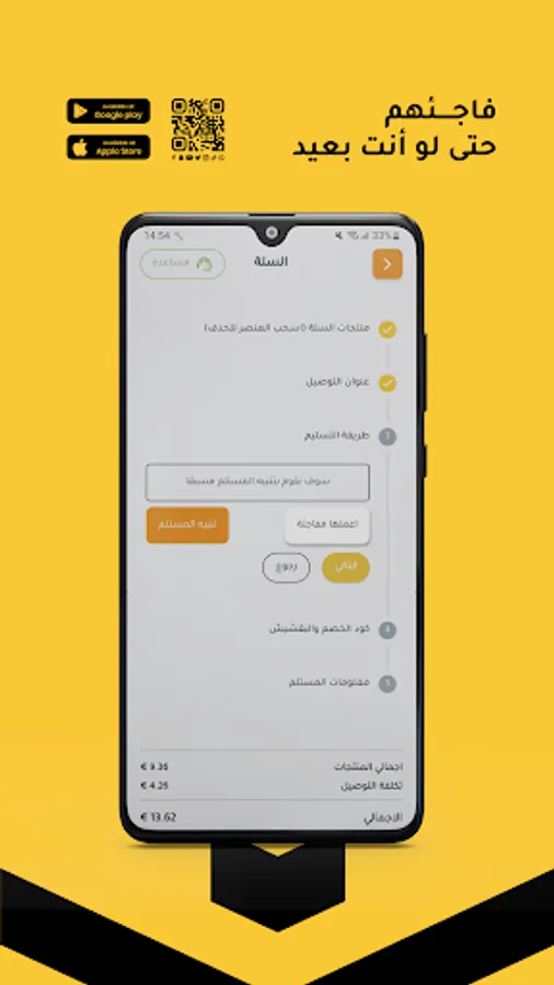 An electronic delivery and shopping application that provides a service that is the first of its kind in the Republic of Yemen, which enables those outside Yemen to visit various Yemeni restaurants, gift and electronics stores and other stores from any country around the world, pay by electronic payment services via credit cards, and buy the appropriate gift Or request the service they want at the lowest costs, and surprise family, friends and loved ones in the easiest and fastest way and from anywhere in the world.