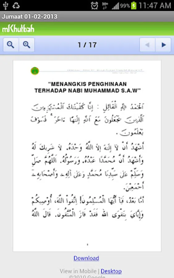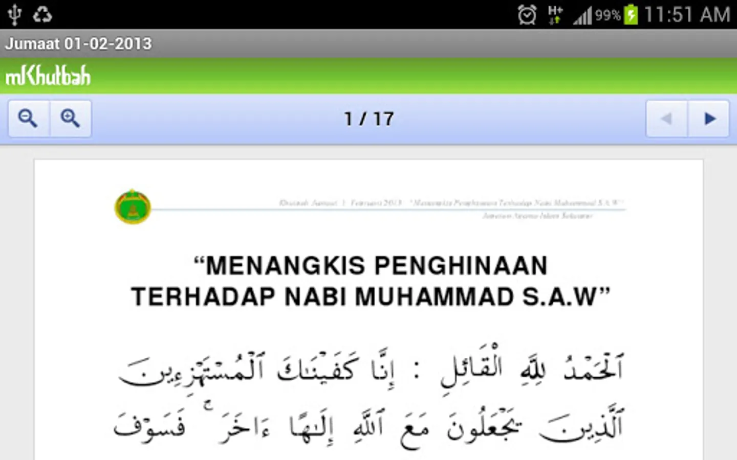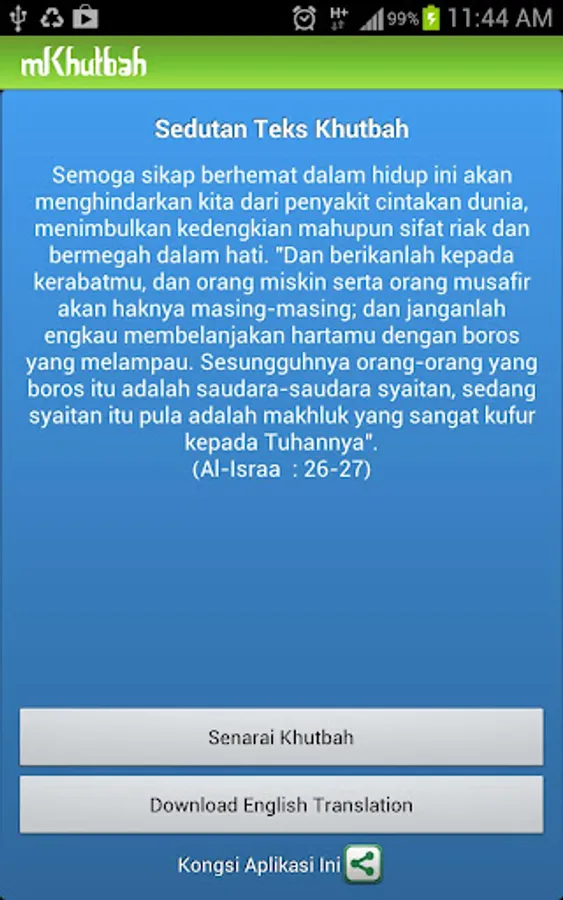 This application delivers text of Khutbah in Bahasa Malaysia and English which gets updated regularly. It is simple yet convenience. The content is taken from Jabatan Agama Islam Selangor (JAIS) website.