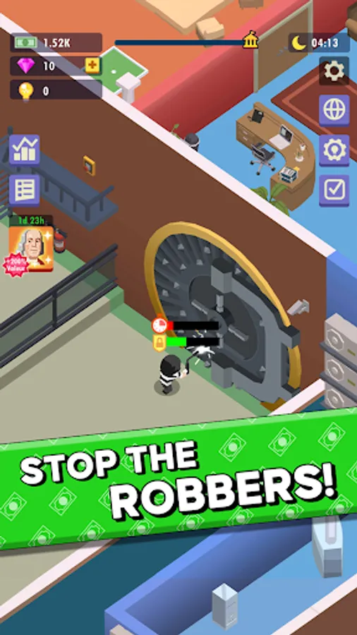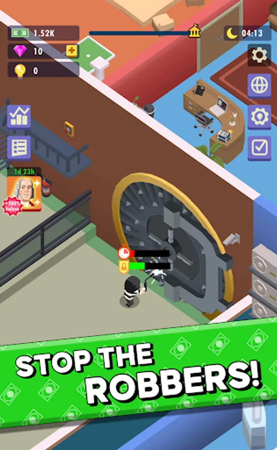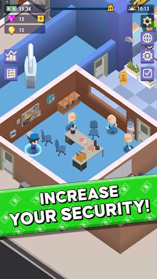 Use Money games to upgrade your premises and hire security staff to prevent heist bank games. The security staff will counter the Bank robbers in case of Idle Bank Heist.