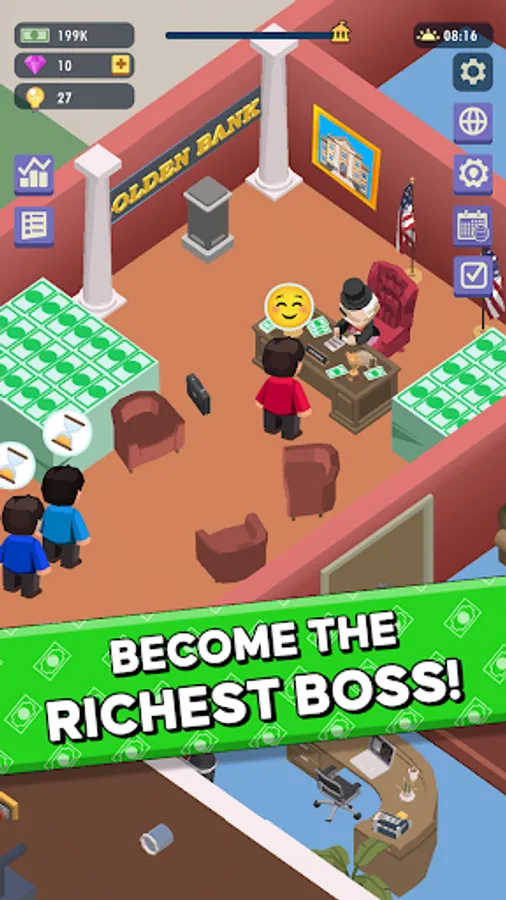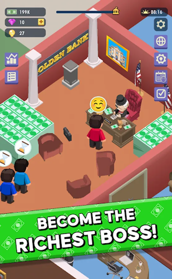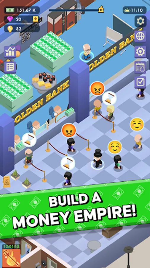 Manage the Idle Bank staff, Hire consultants, Banker, Cashier, customer service and security staff in Idle Business Tycoon Games. Handle your finances, pay the Idle Bank expenses and staff salaries like in Bank Job Simulator.