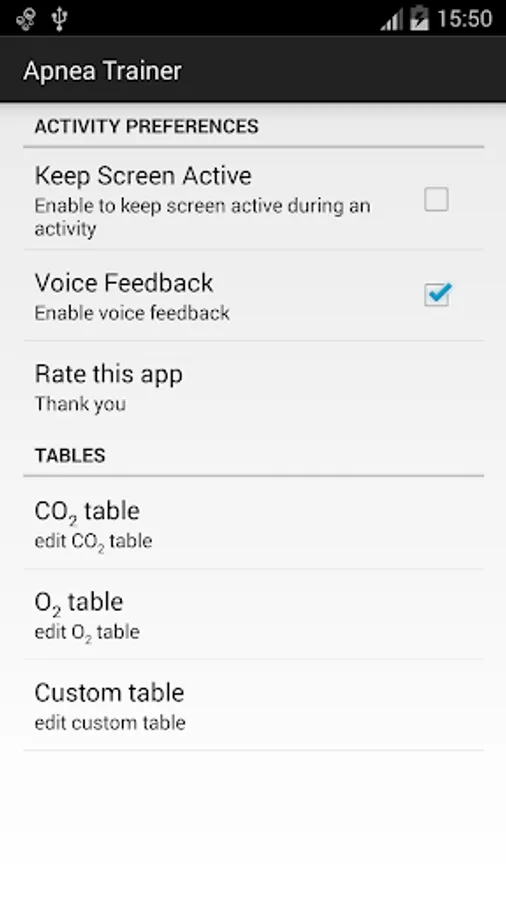This application let's you set you own co2 or o2 tables or use default ones. You can also create your own custom tables.