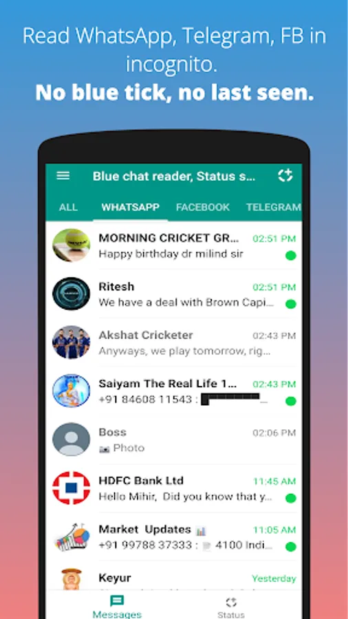 'Blue tick hider, incognito chat reader' makes reading telegram/facebook/whatsapp messages, audio, photos, video and Whatsapp Statuses, simple, secure and fast.