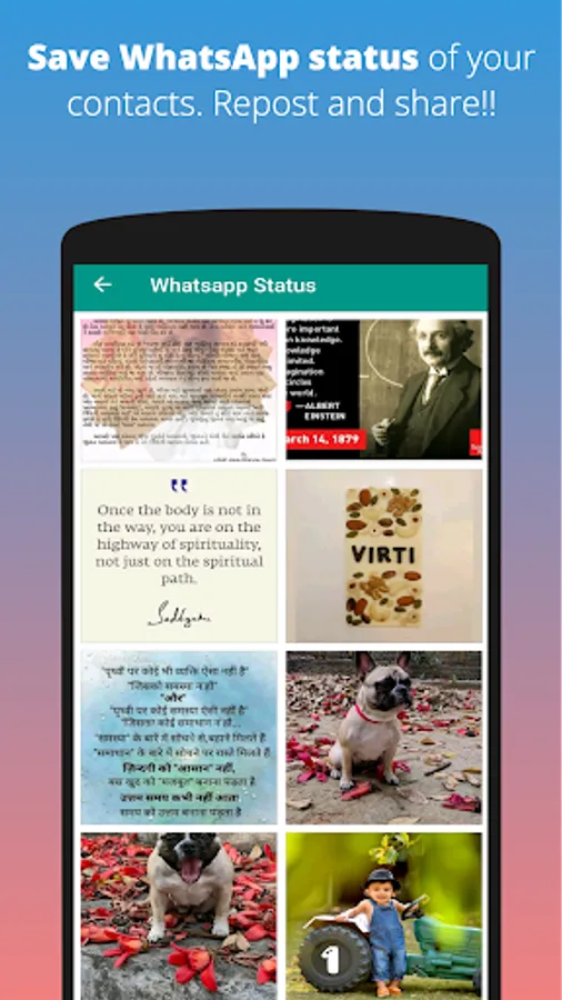 Did you like your friend's WhatsApp status and want to download/share it with others? This app has the feature of saving and sharing WhatsApp status videos and photos.