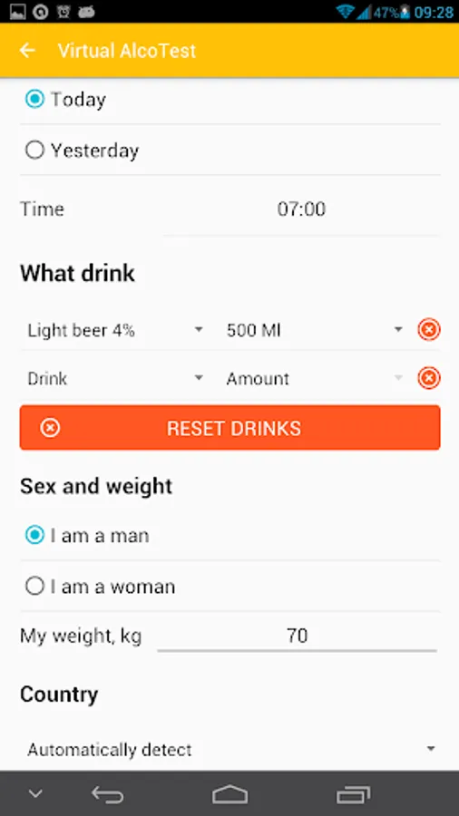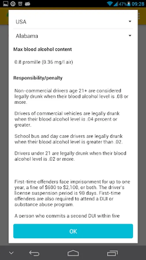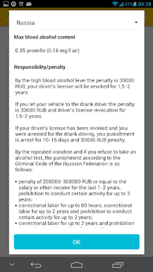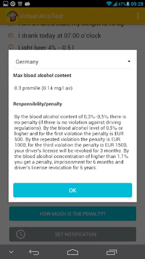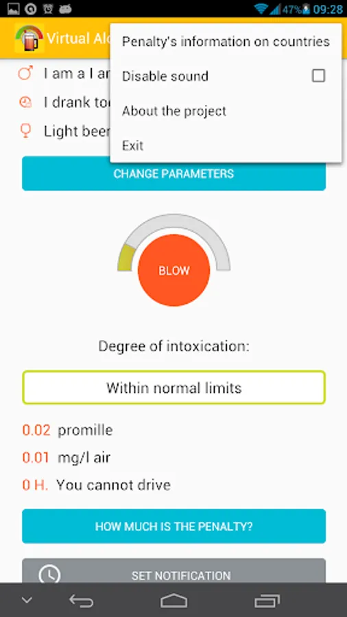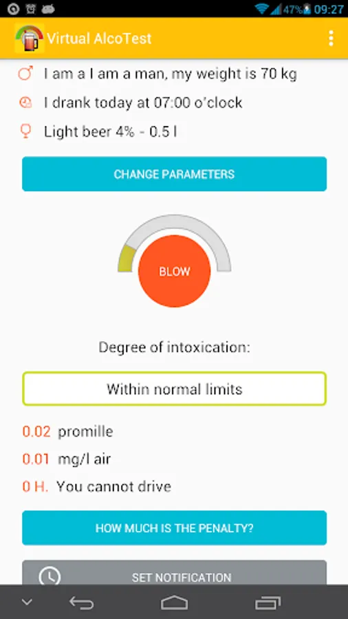 The program "Virtual Alcotest" will become your indispensable assistant - a calculator to quickly calculate the number of ppm in the exhaled air, and their compliance with the maximum permissible error. Mobile Breathalyzer allows to determine the blood alcohol level on a number of parameters, user-selectable: a kind of alcohol, the amount of alcohol consumed, weight, height and gender. A second application will display the possible volume ppm in the blood. And also tell the time period for which the alcohol level drops to the maximum permissible driving in your country. The app will indicate the excess of admissible norm ppm for any country of the world, including Russia, USA, European countries. Select a country and find out the actual legislative norm on the level of alcohol for drivers. The user can set the beep warning of expiry of the period of intoxication.