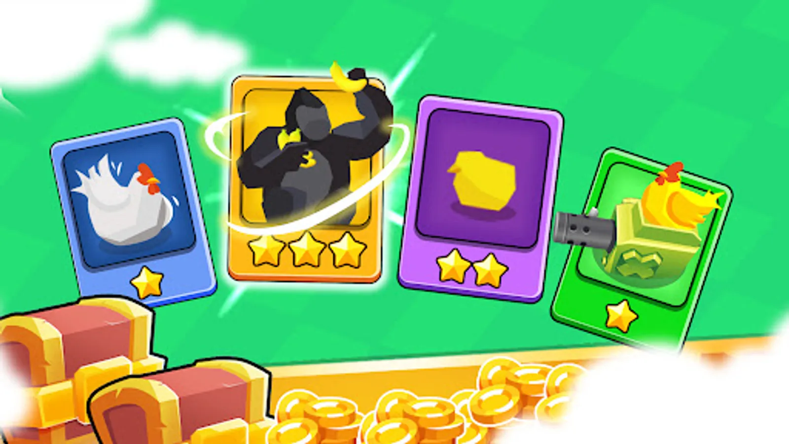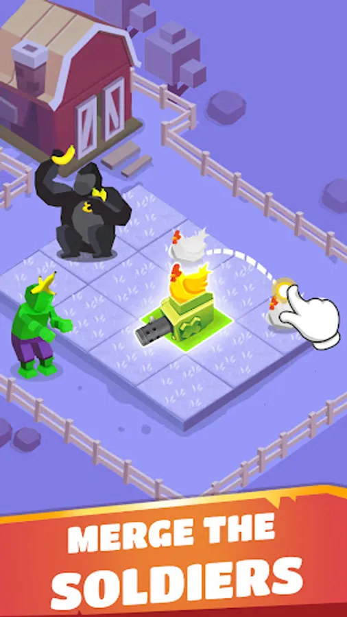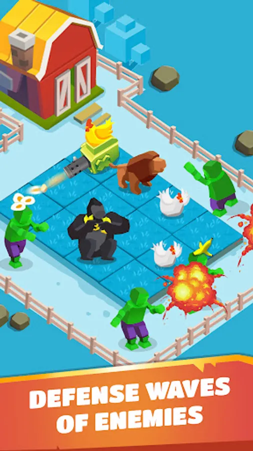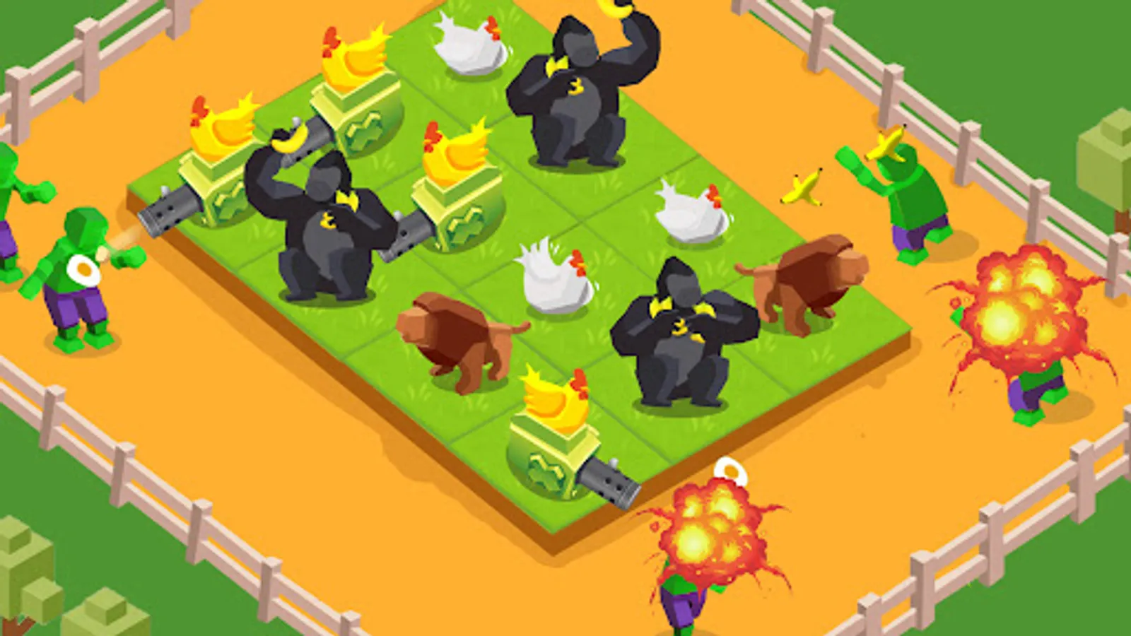 Get started with basic animal soldiers such as chicken, cow, cat. Merge them to upgrade to a higher level, stronger species like gorrila, lion or even dinosaurs. It's up to you to merge fast enough all your animals and fight the zombie.