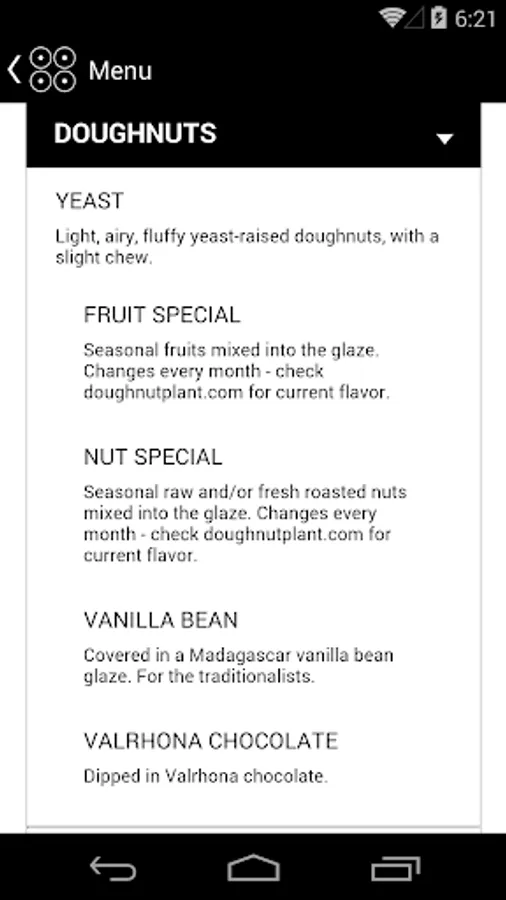 The official Doughnut Plant loyalty app! We make doughnuts by hand with the highest quality, all natural ingredients. Our new app lets you pay securely with your phone and earn rewards along the way. You can also browse our current menu and find our nearest locations.